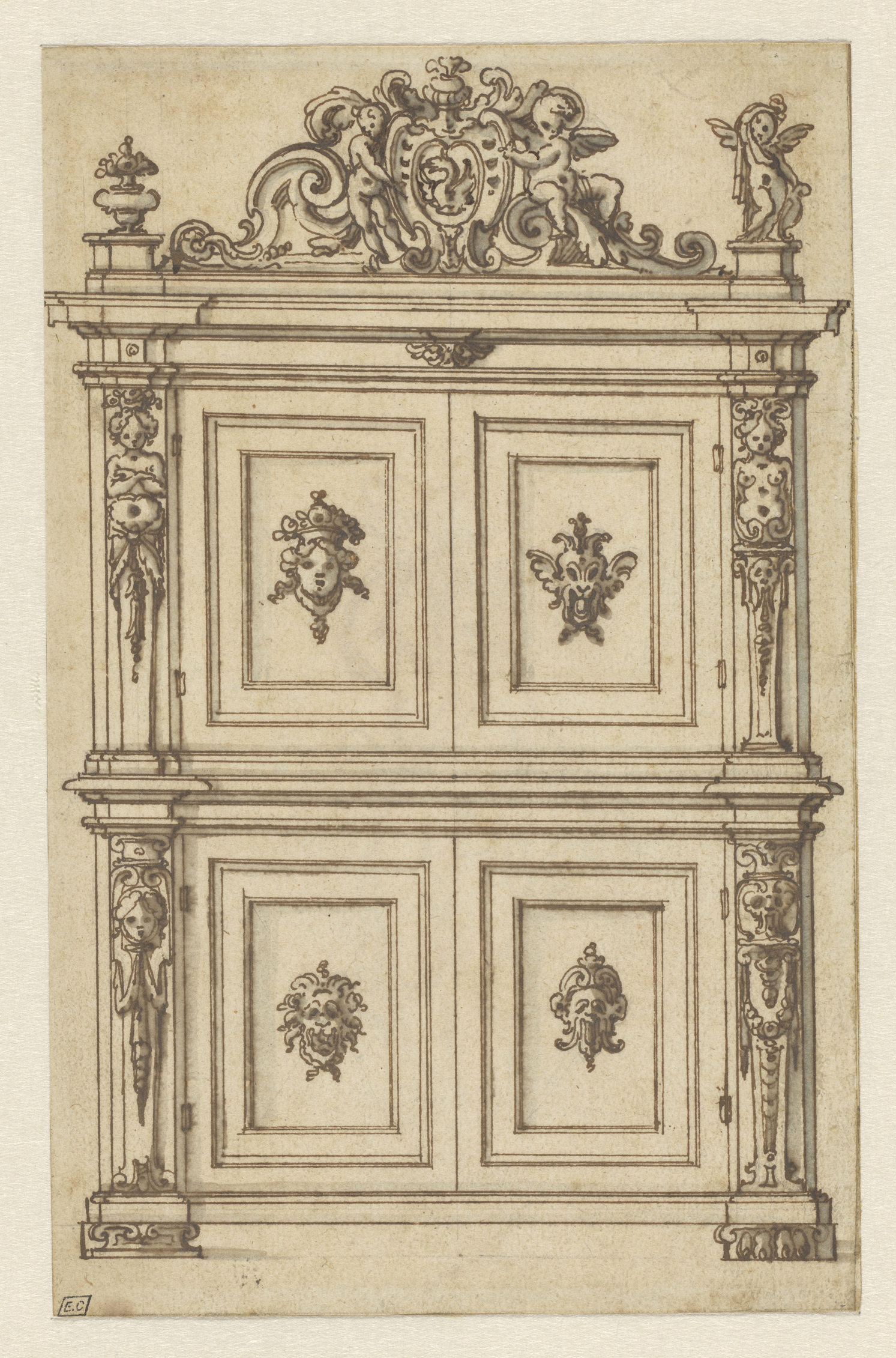 Ontwerp voor een kast met marqueterie van een figuur...