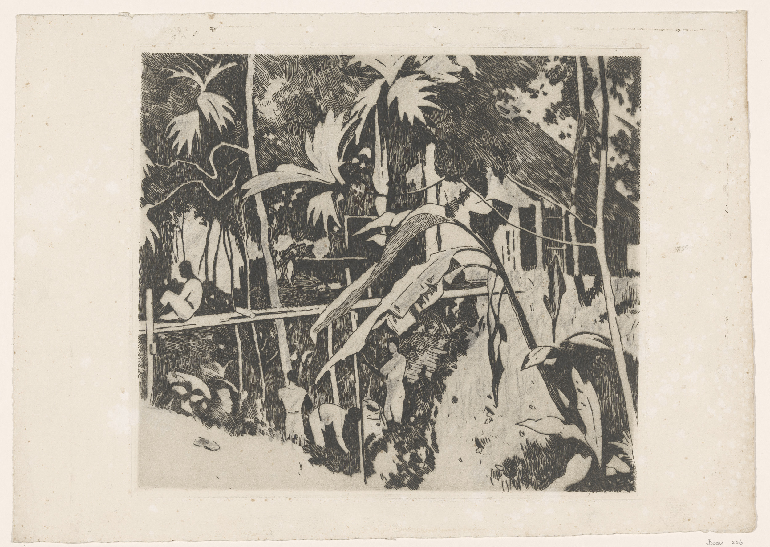 Hurkend figuur tussen bomen in Buitenzorg