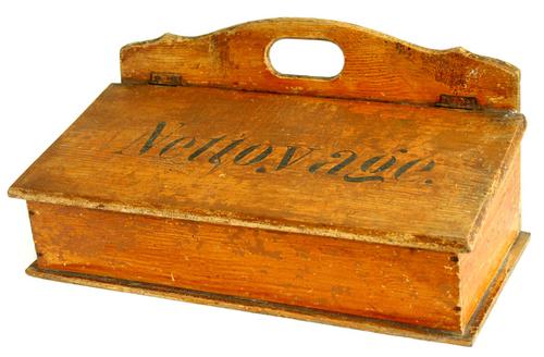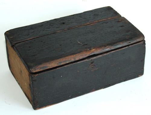 Langwerpige vurenhouten kistje met schuifdeksel.