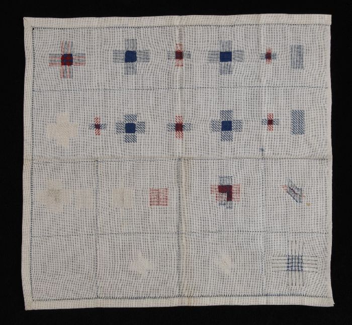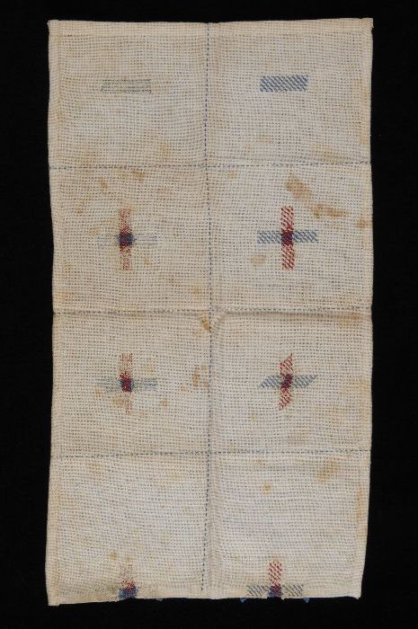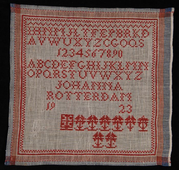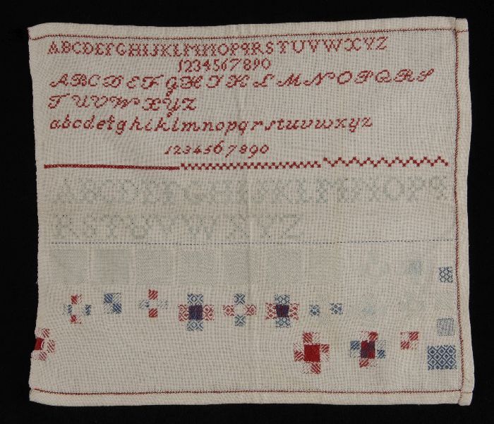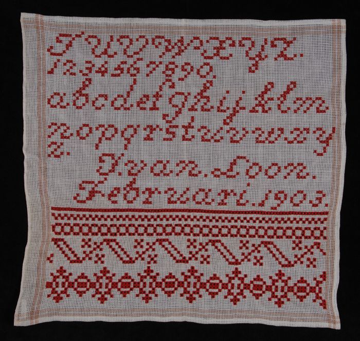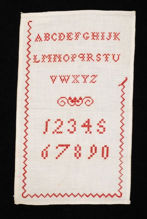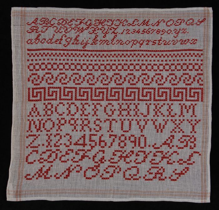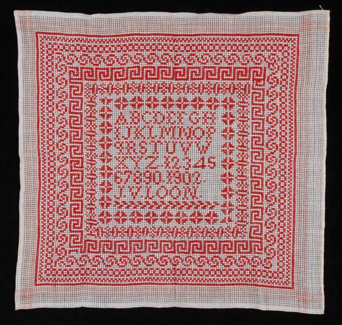 Merklap of letterlap gewerkt in kruissteek in rood k...