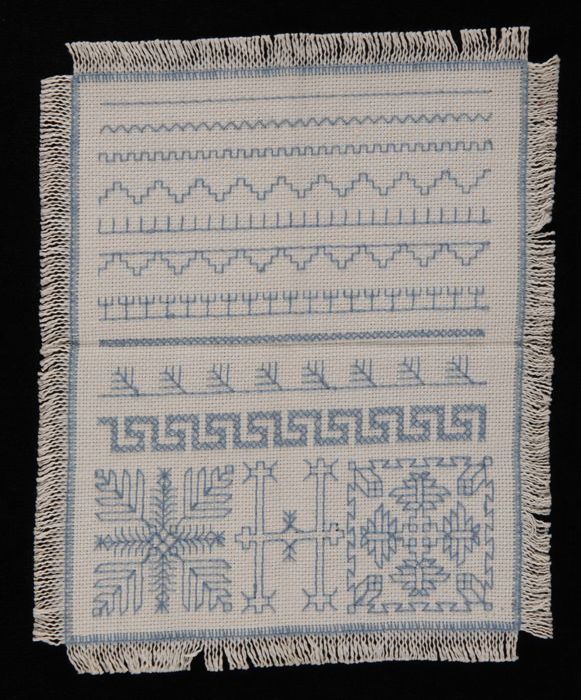 Stekenlap gewerkt in blauw katoen in Holbeintechniek...