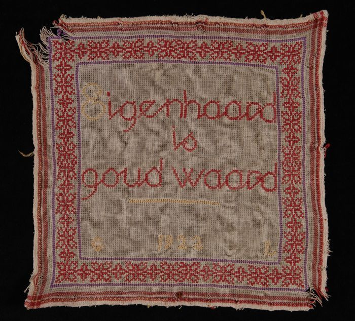 Letterlap gewerkt in rood katoen op grof wit katoene...