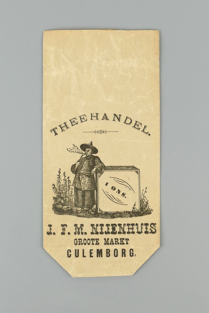 zakje van papier gedrukt voor de theehandel van J.F....