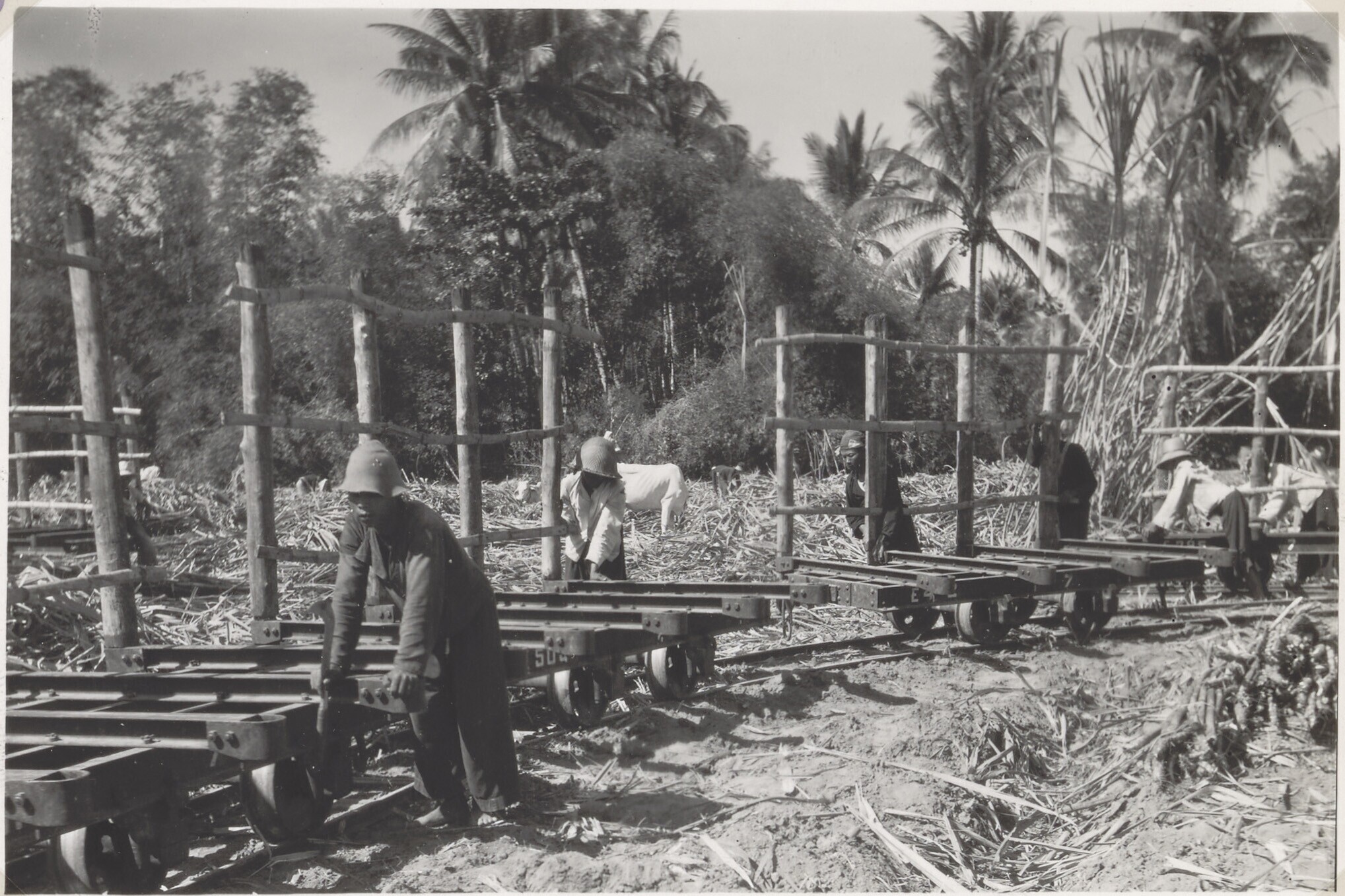 Aanvoer ledige lorries in snijtuin Ngidjo