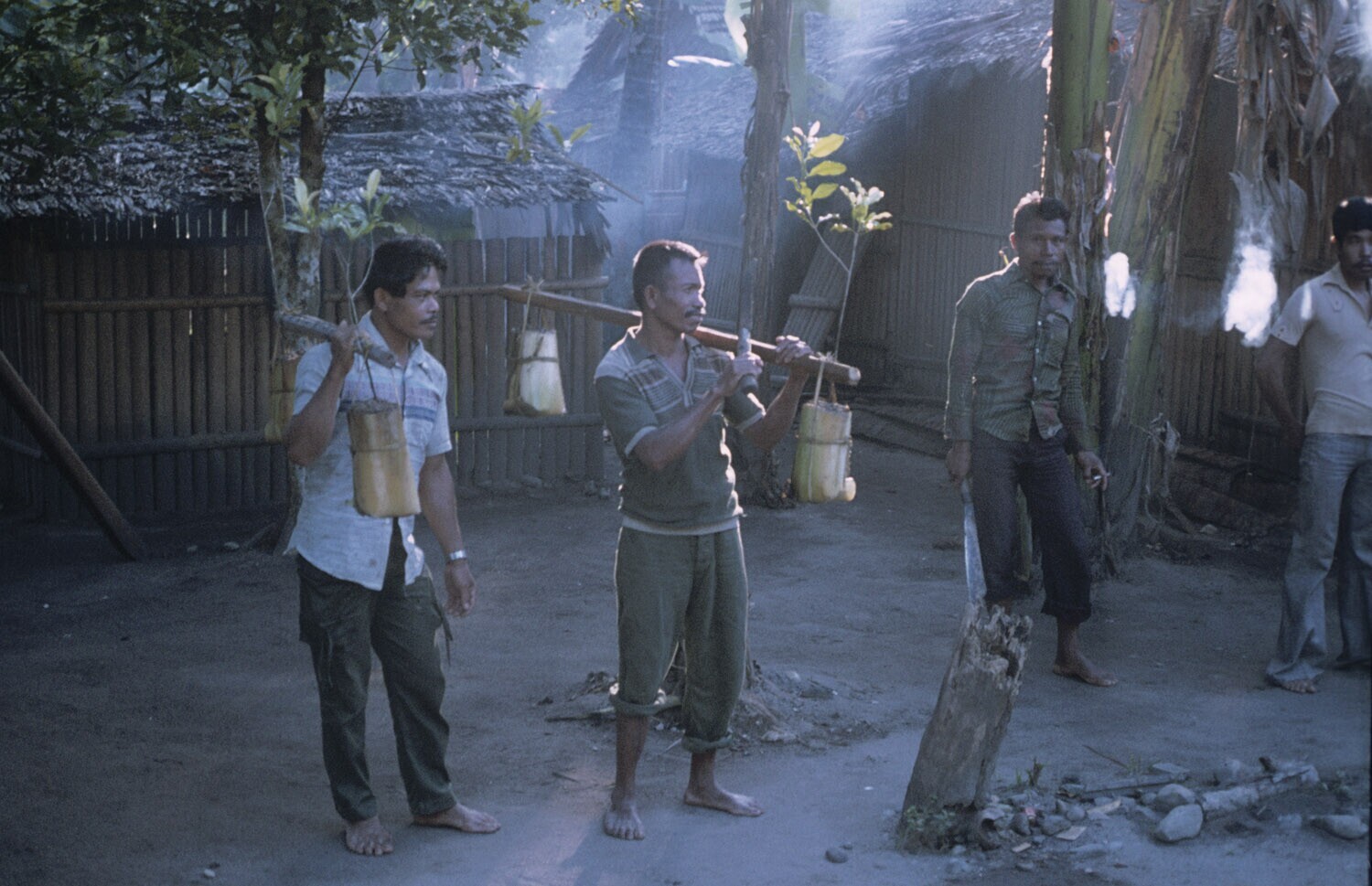 Mannen staan klaar om jonge kruidnagelboompjes uit t...