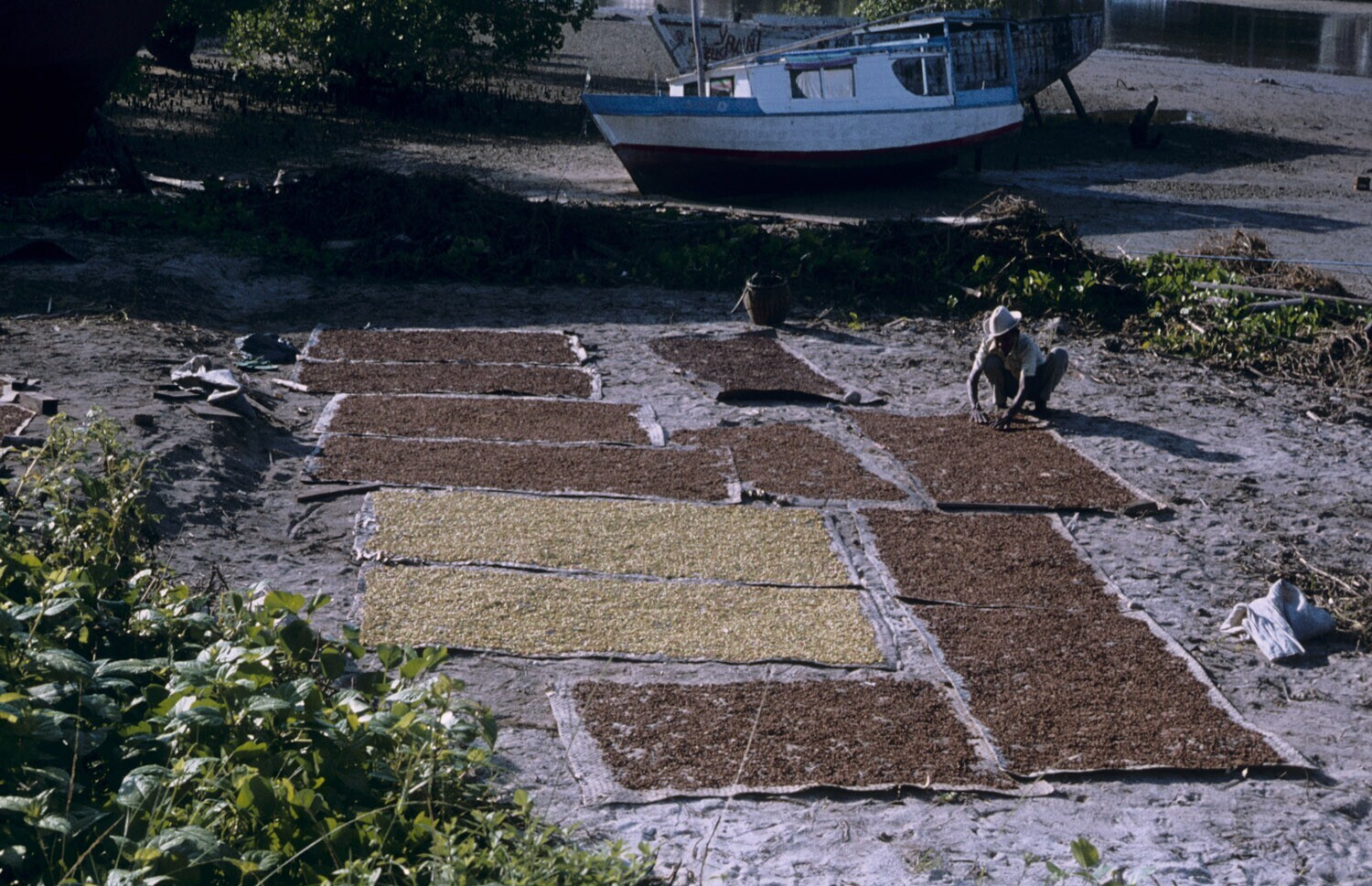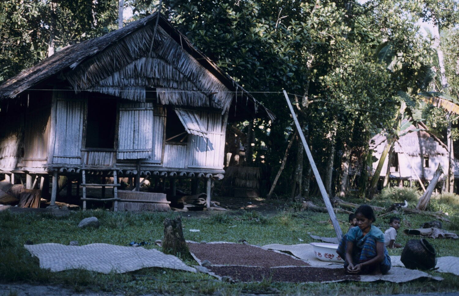 Huis met daarvoor matten met drogende kruidnagelen, ...