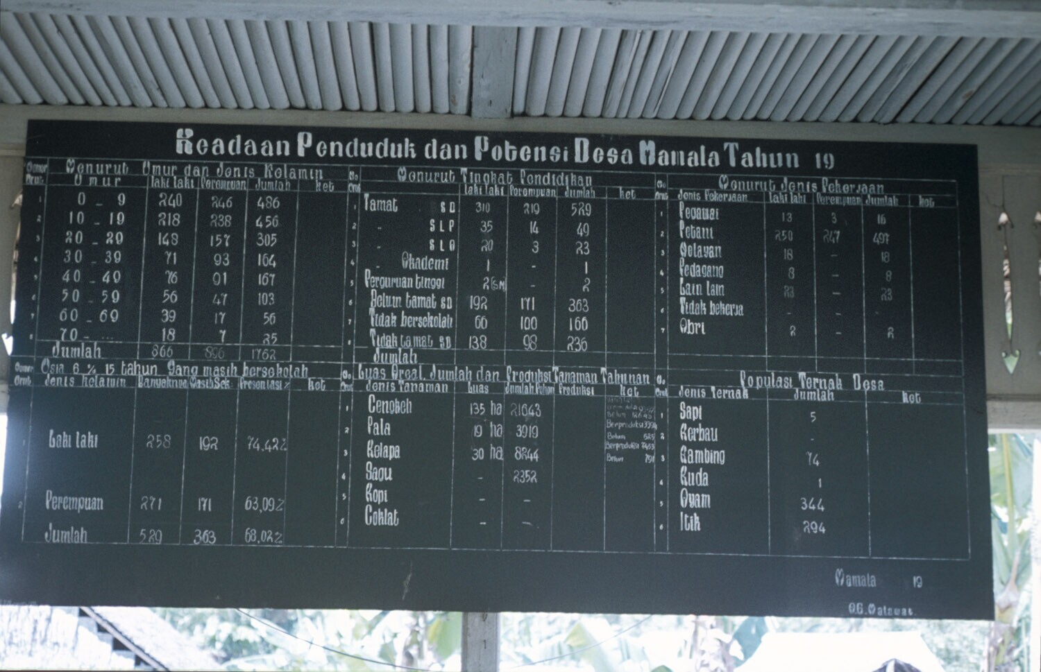 Een bord met allerlei gegevens over Mamala, Ambon, M...