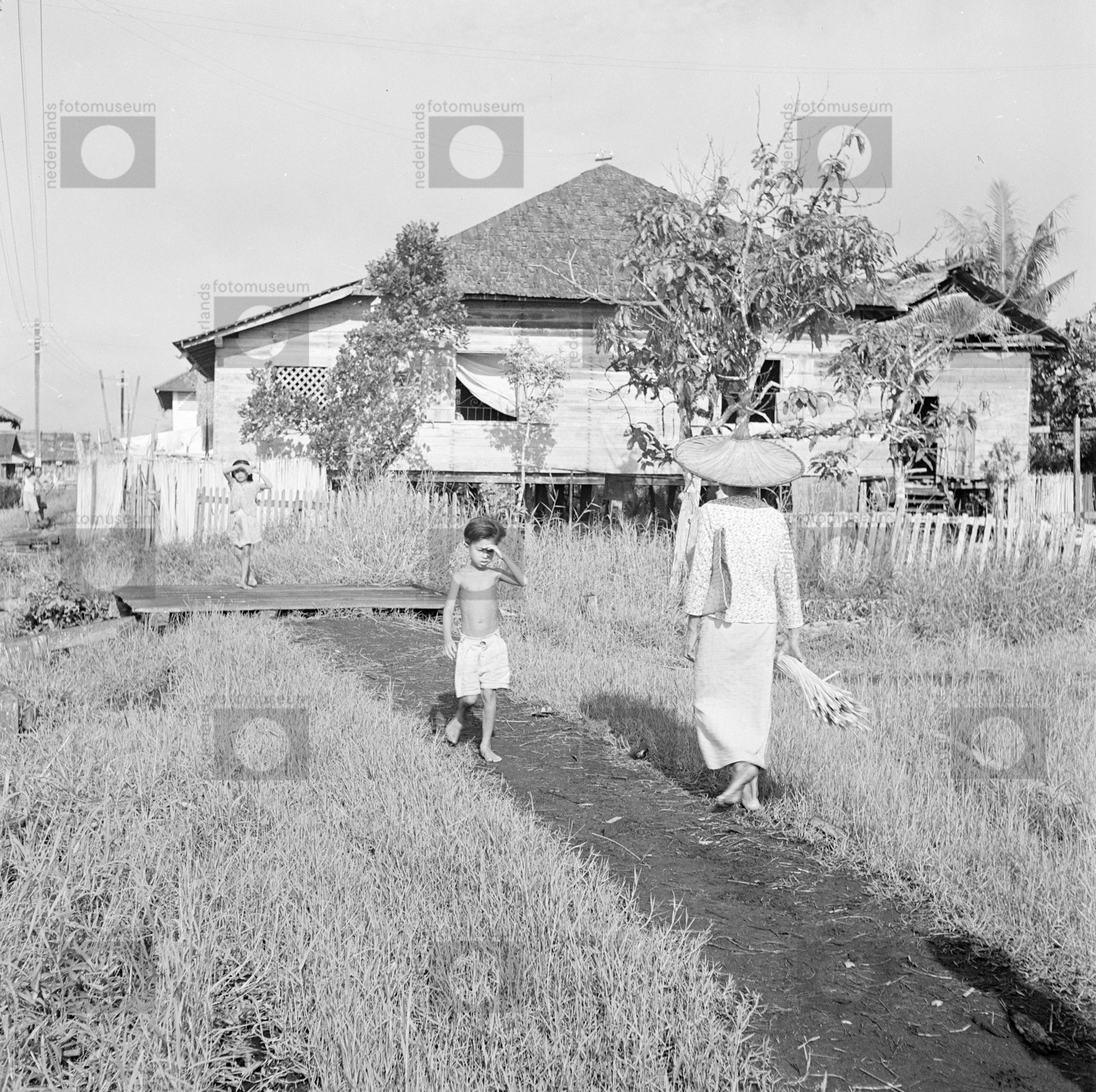Een jongen en een vrouw lopen voor een inheems huis ...