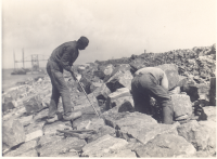 Drie mannen (steenzetters) op een basalttalud, waars...