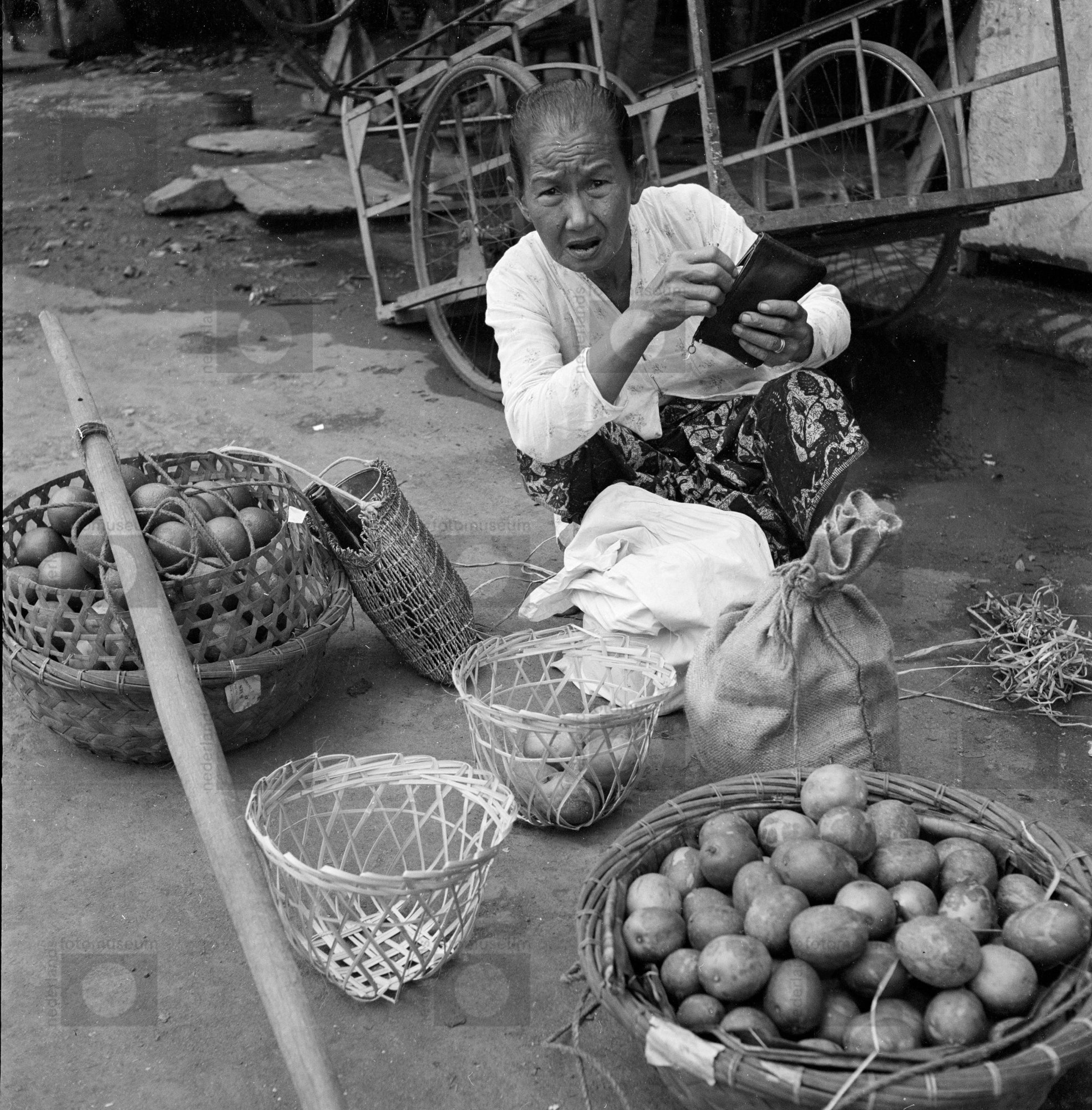 Een oudere vrouw zit bij twee manden met groente op ...