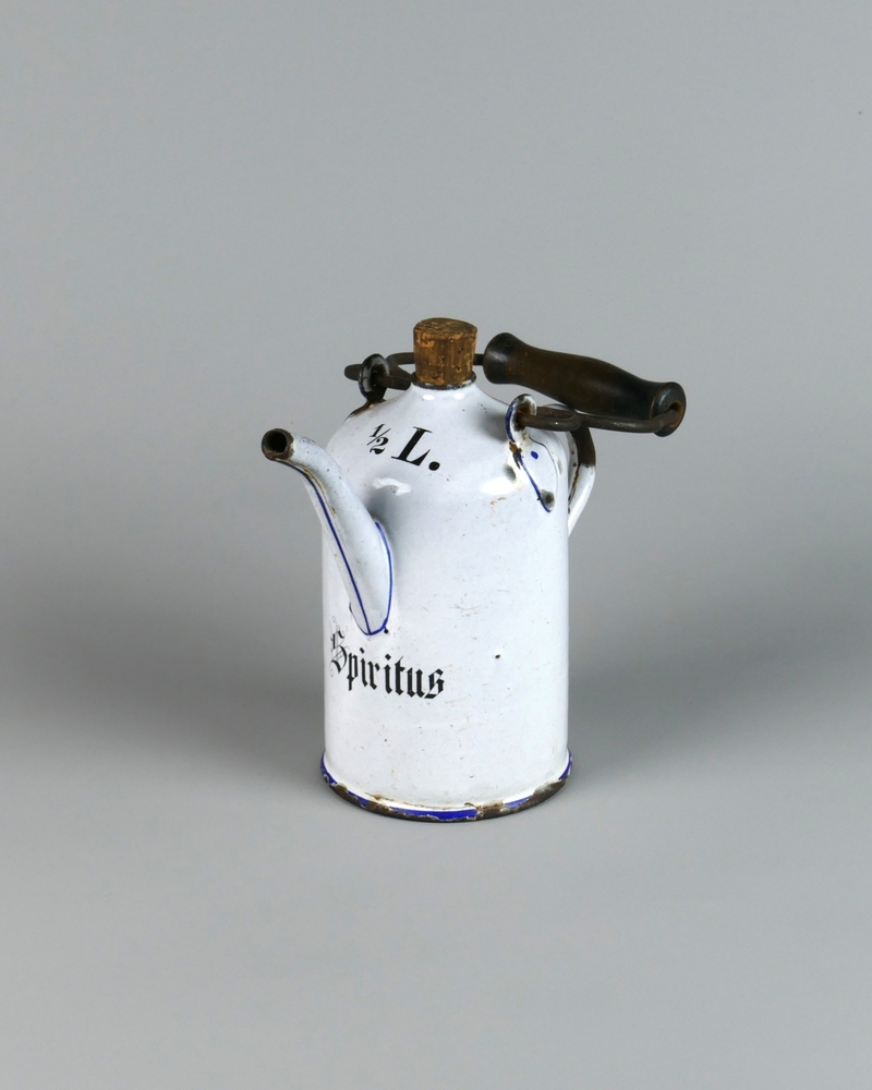 Kannetje van geëmailleerd metaal met hengsel en kurk...