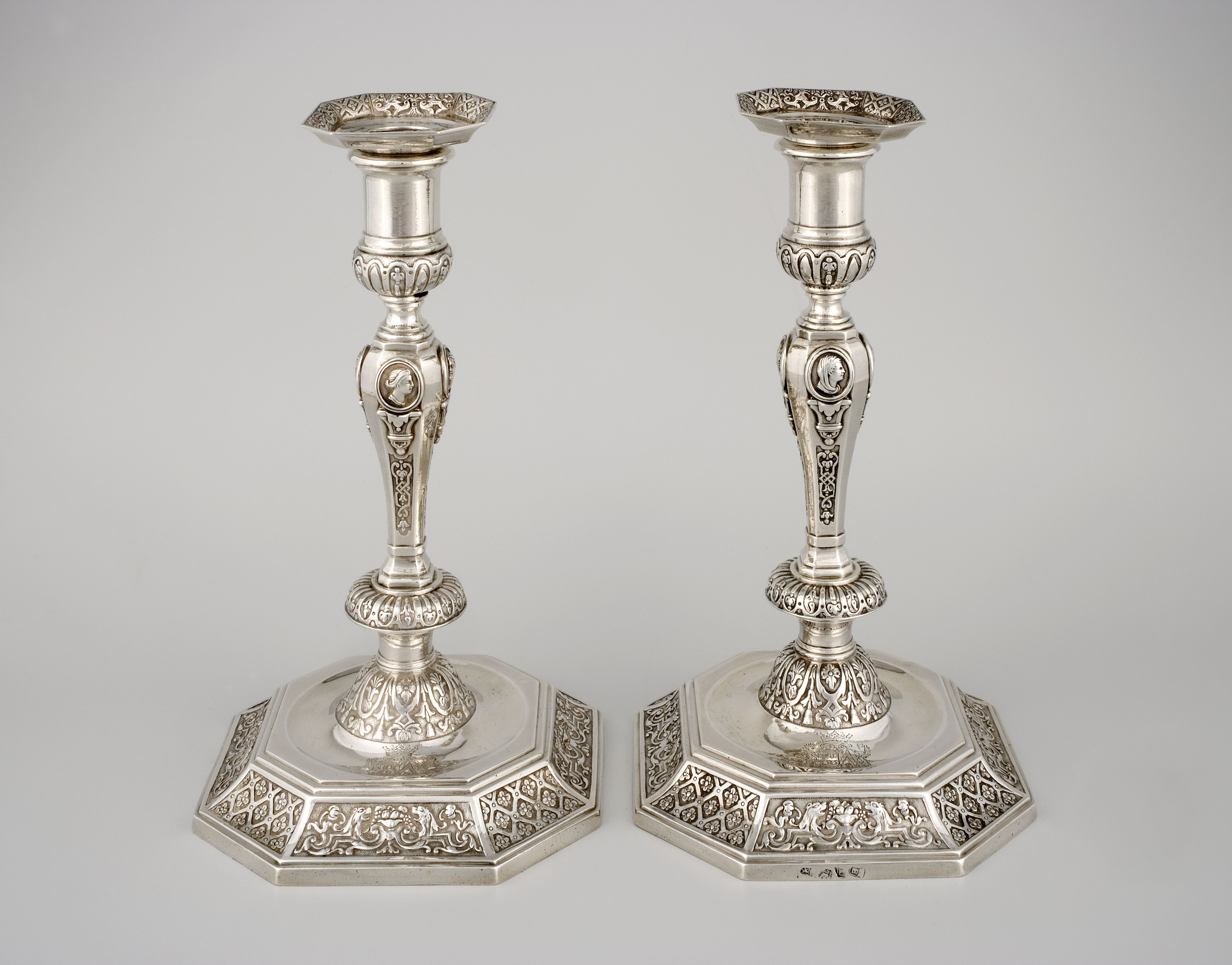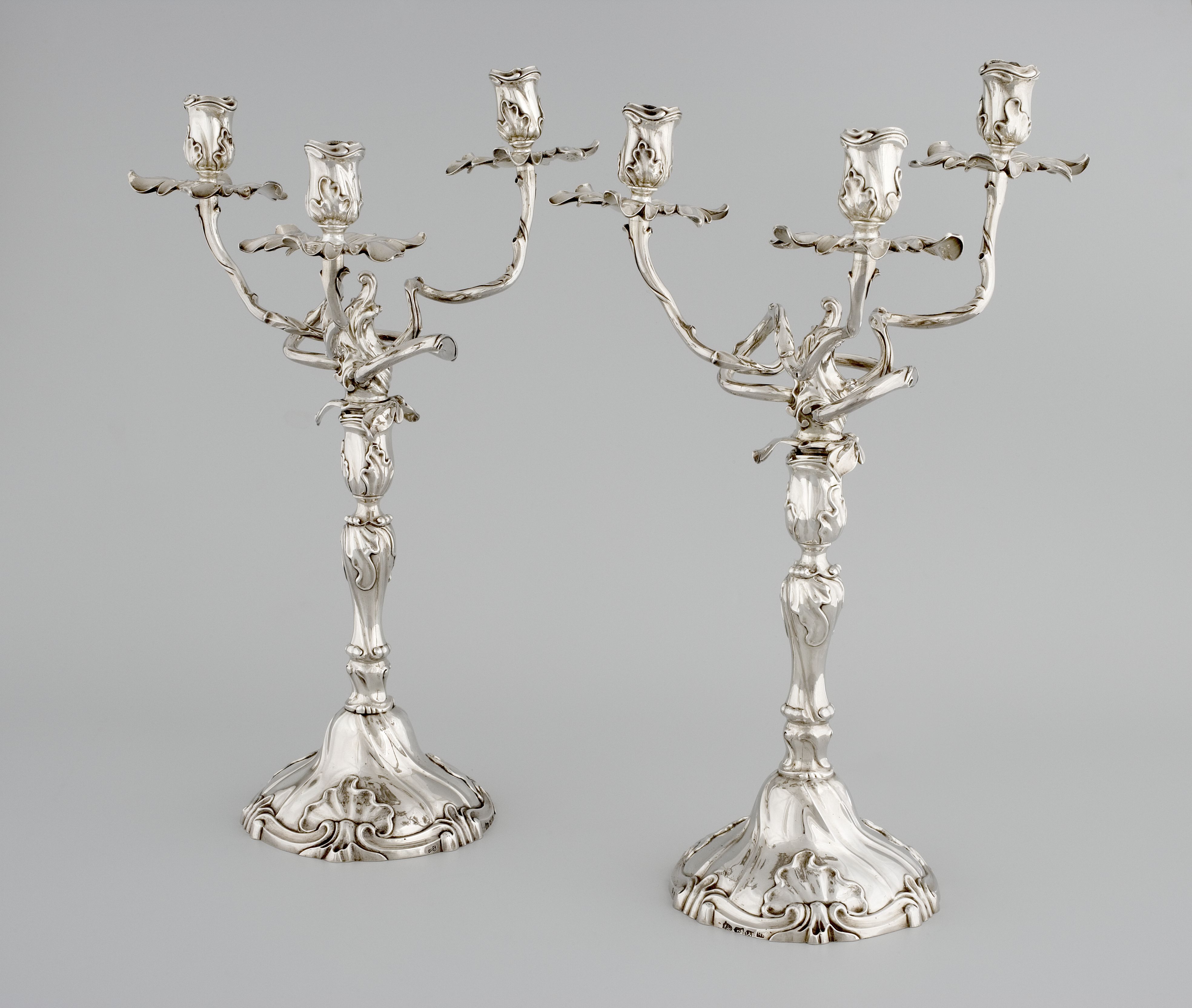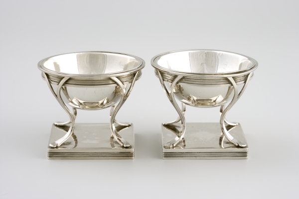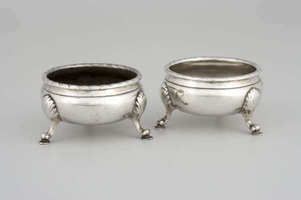 Twee zoutvaten op drie pootjes met schelpvormige aanzet