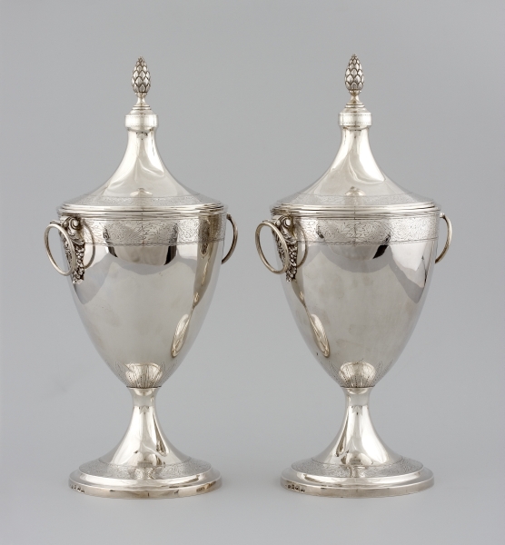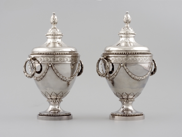Twee kastanjevazen, versierd met parelranden, guirla...