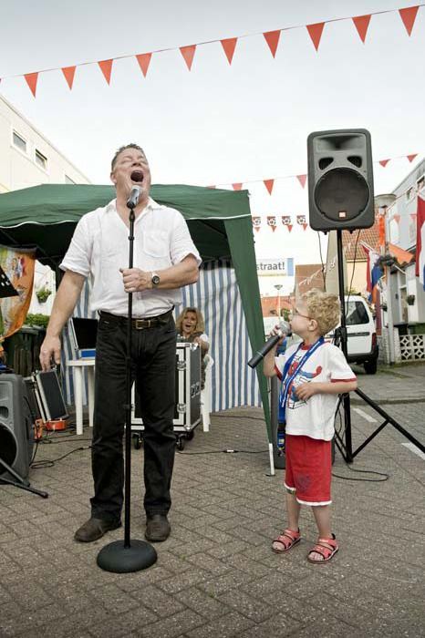 Ingehuurde zanger tijdens straatfeest in de Roggestr...
