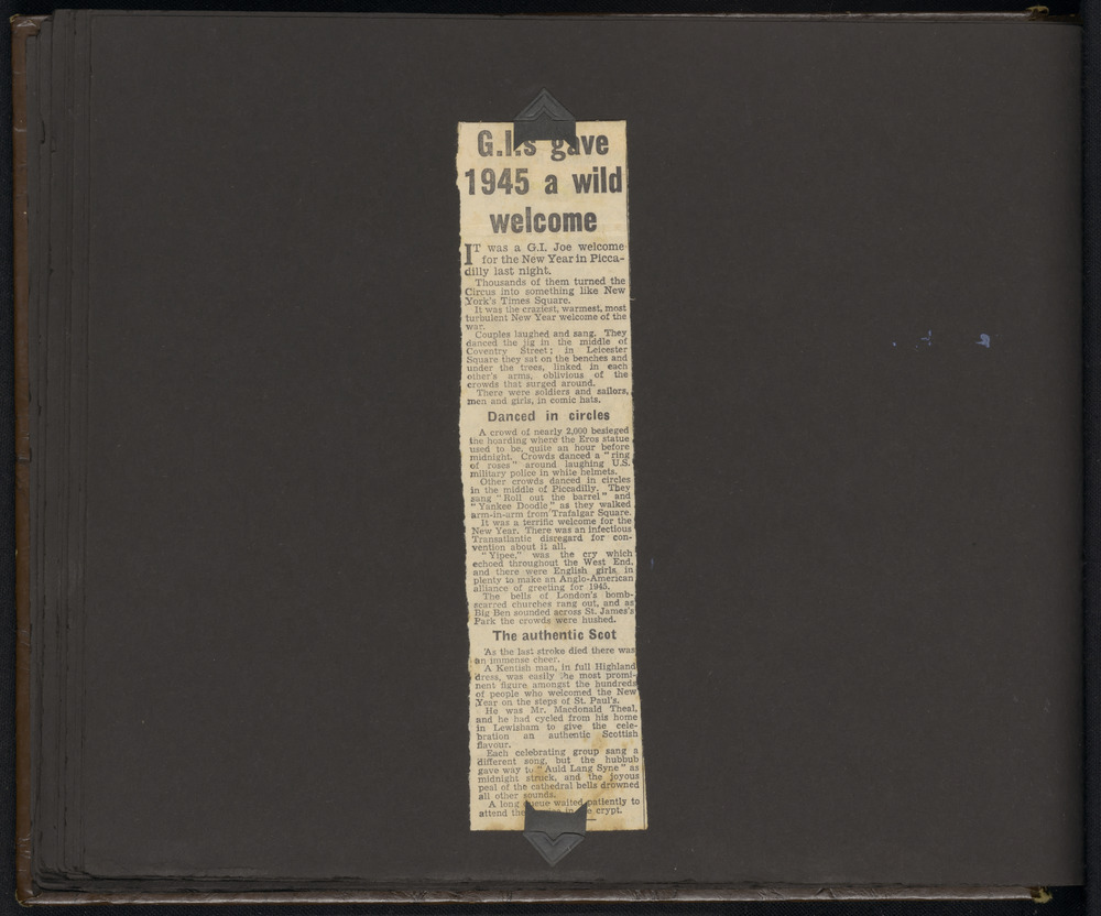 Een krantenknipsel "G.I.'s gave 1945 a wild welcome".