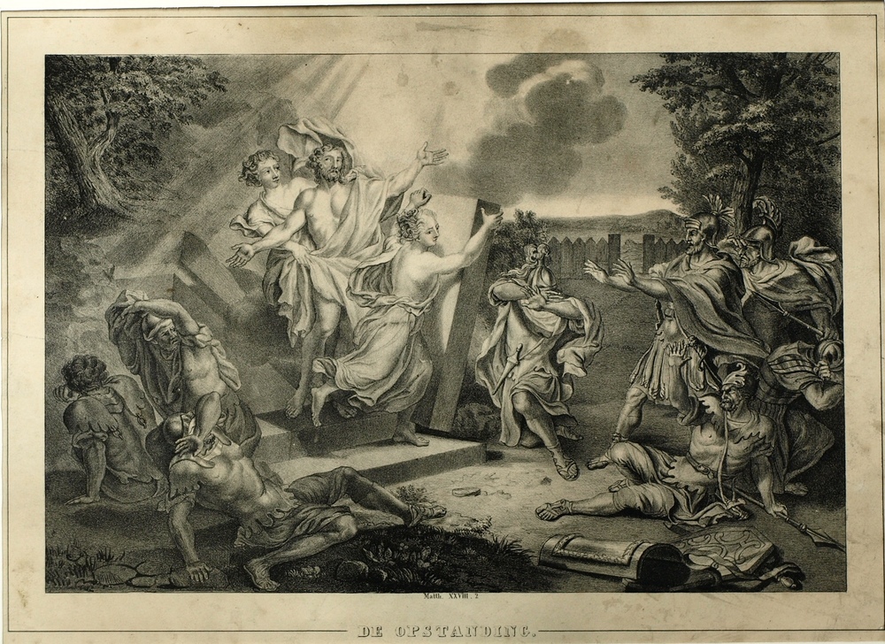 Gezicht op landschap met geopend graf met uitbeeldin...