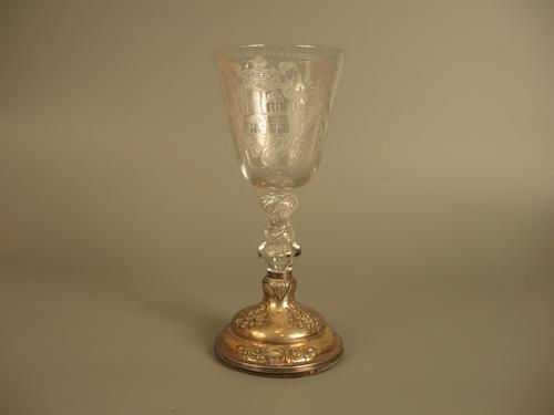 Glazen bokaal met deksel "Veel Handen Licht Werck"