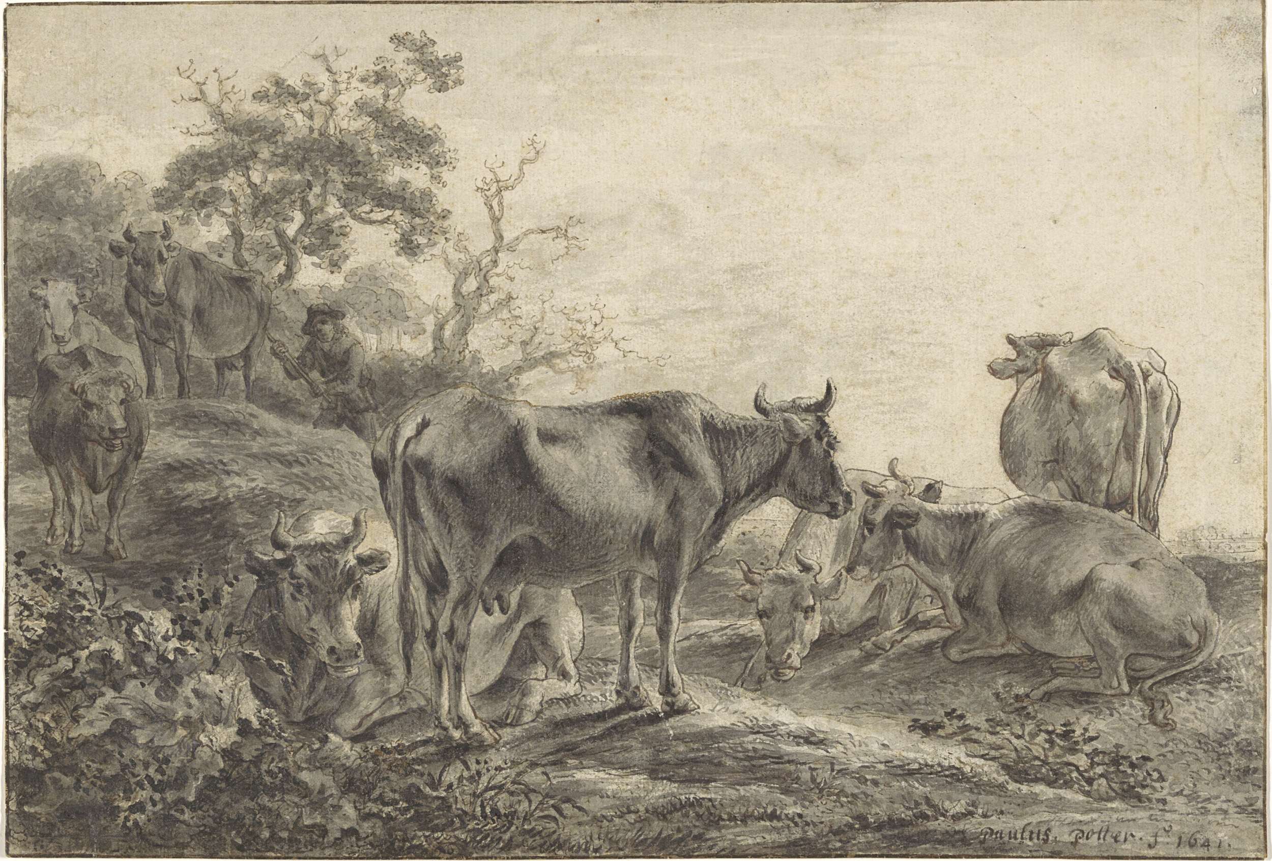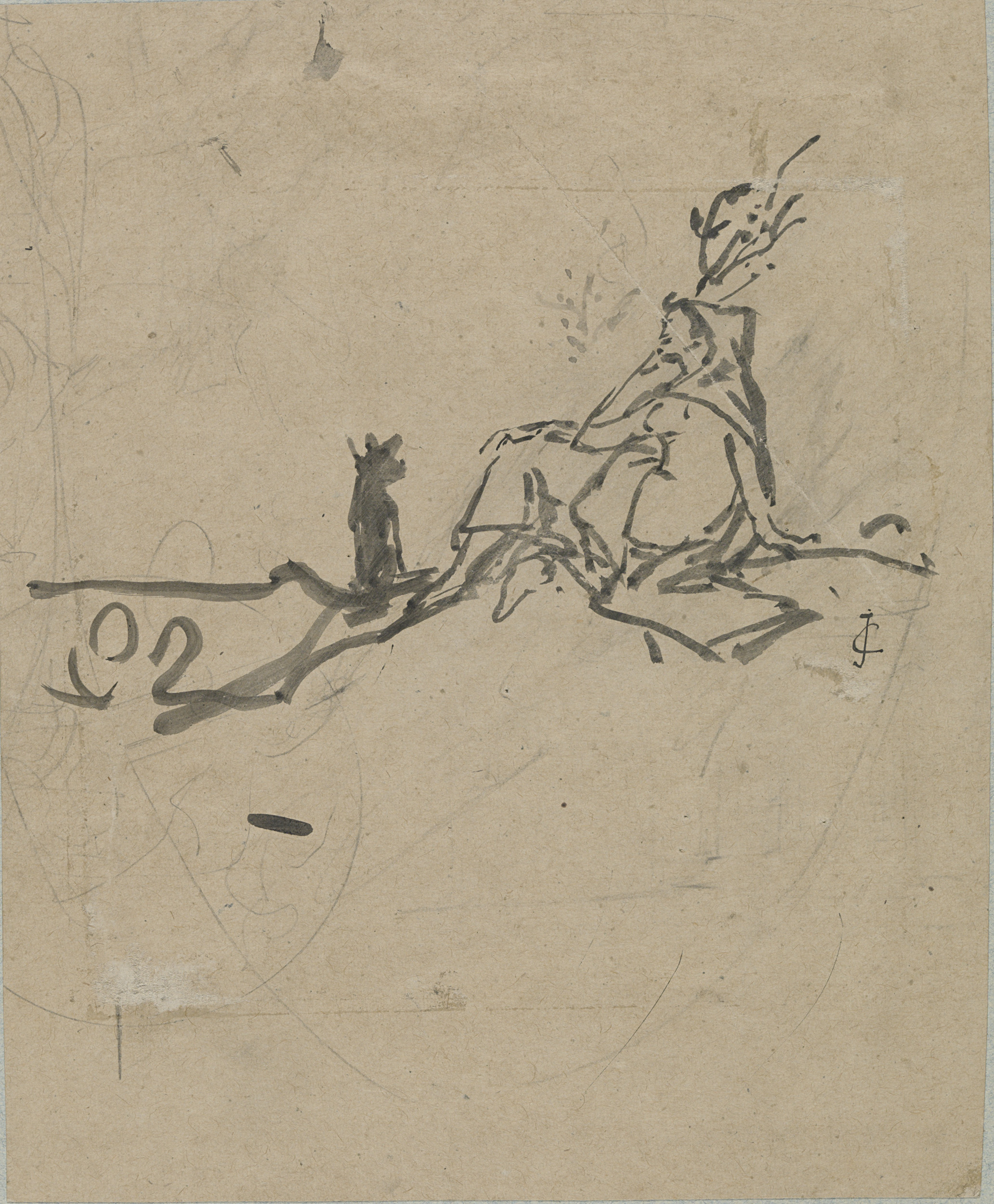 Zittende figuur met hond bij boom (op vaaslichaam?)