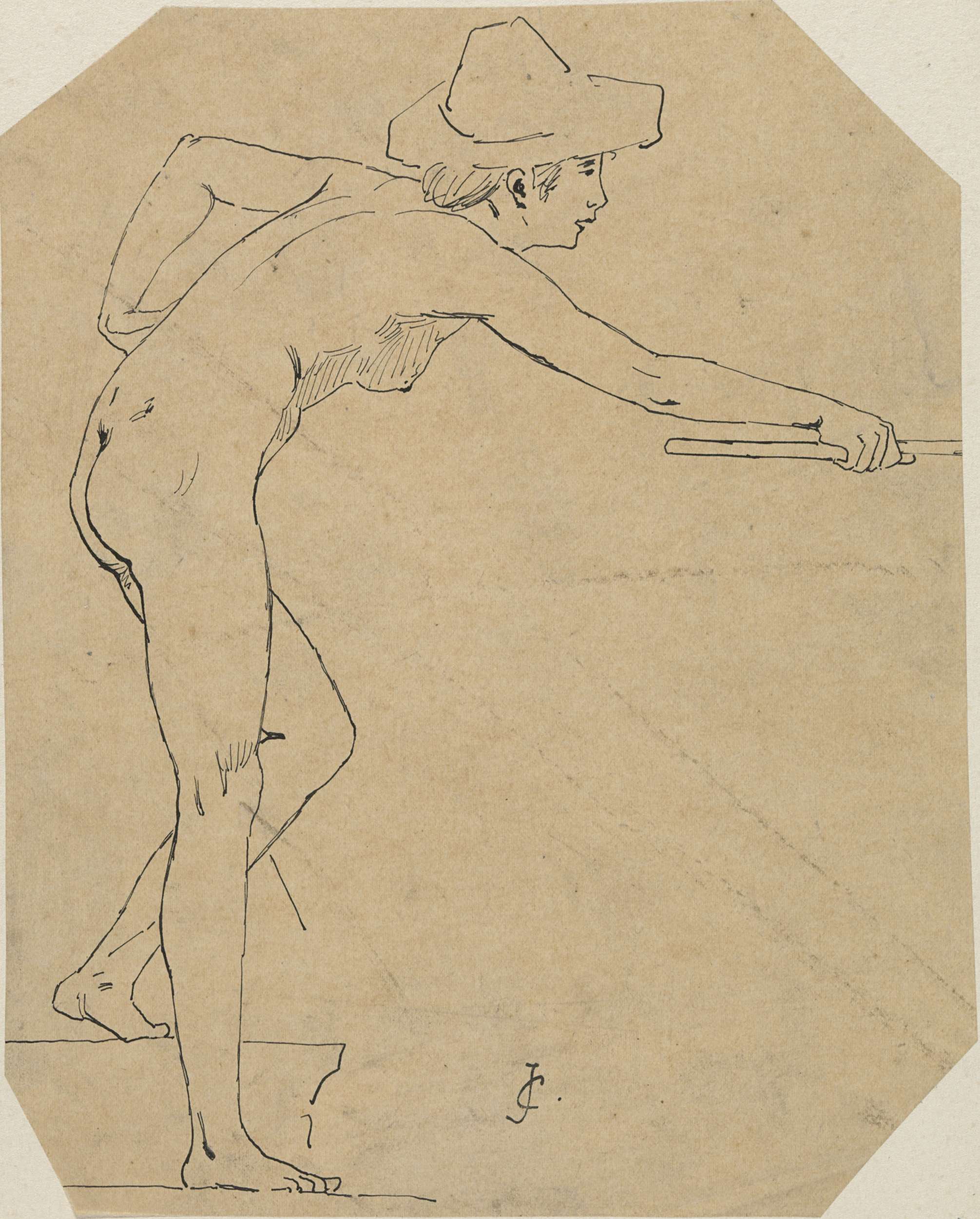 Naakte voorovergebogen jongen met hoed en stok