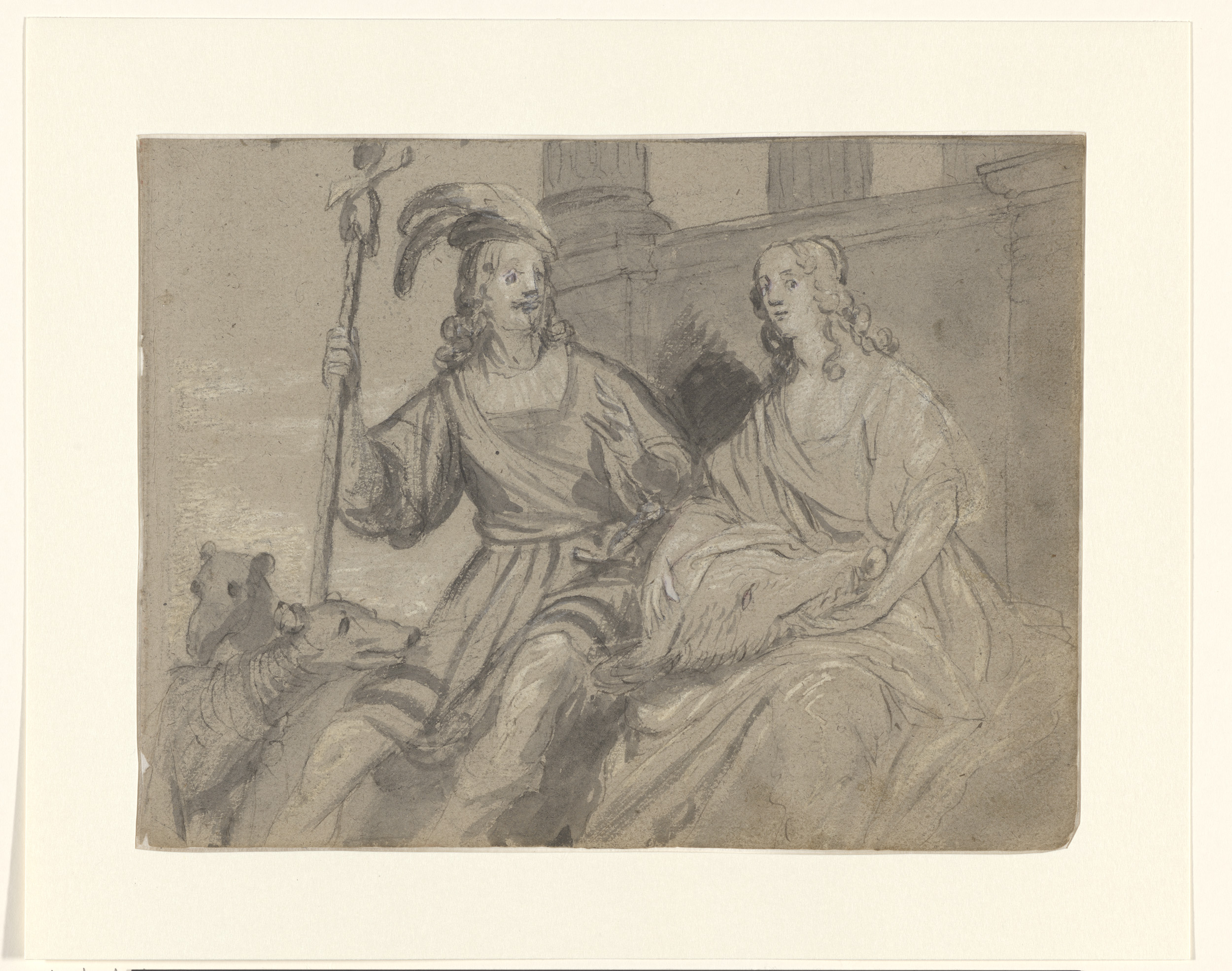 Vrouw met bloem met faun met staf