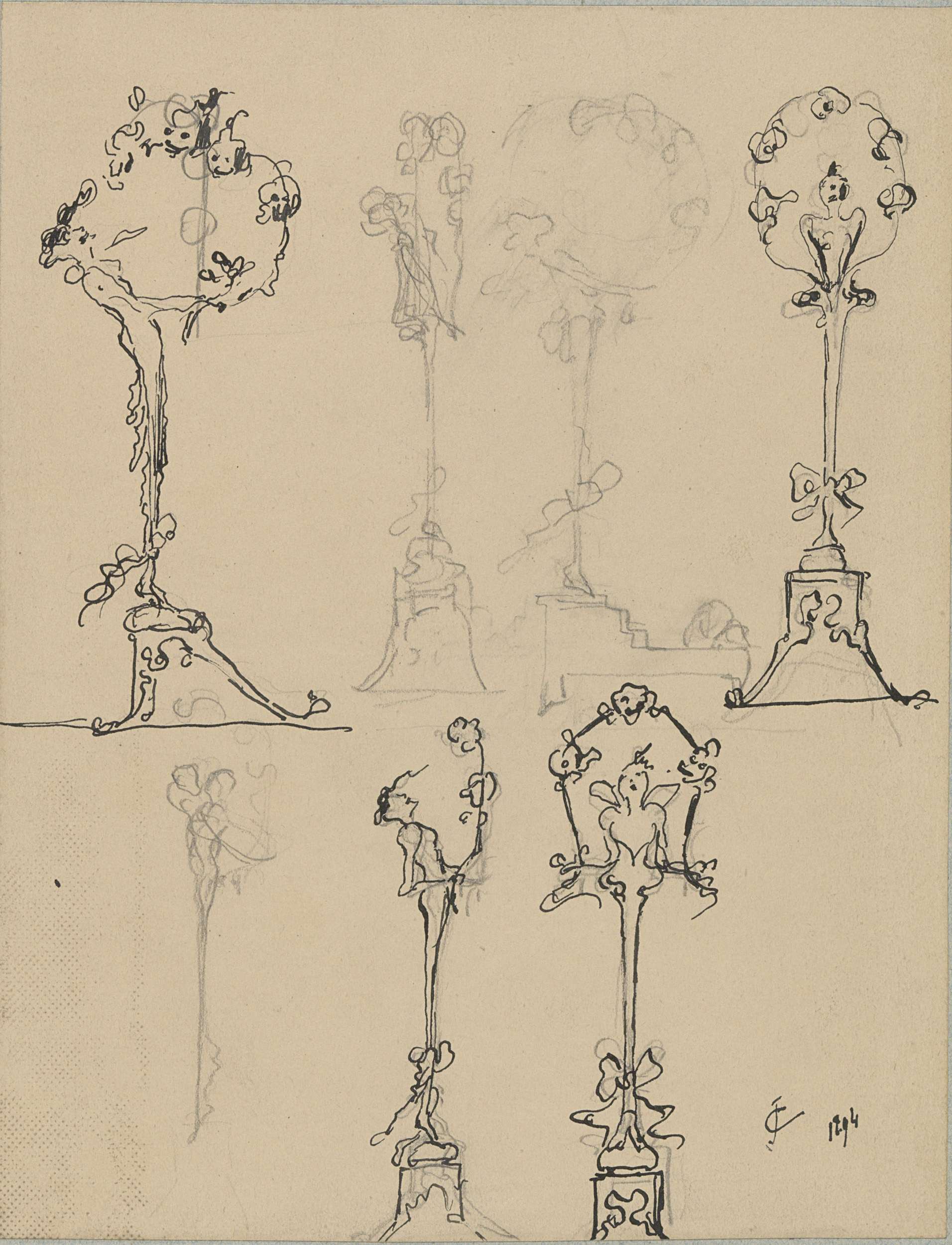 Zeven schetsen voor torchères met een hermfiguur en ...