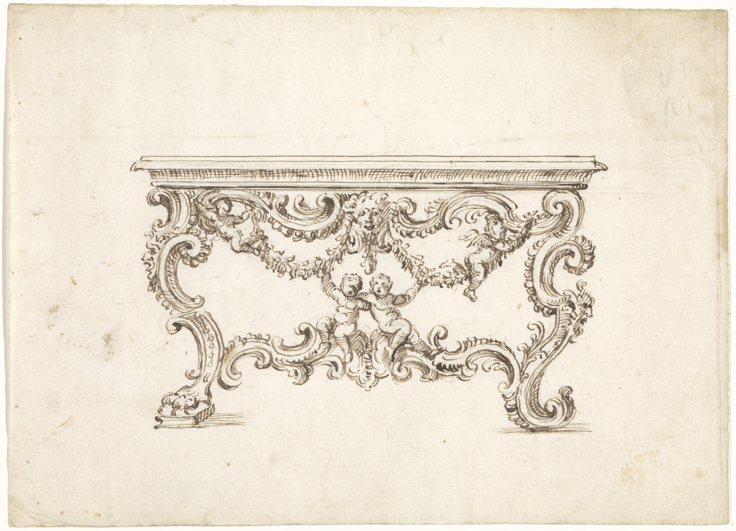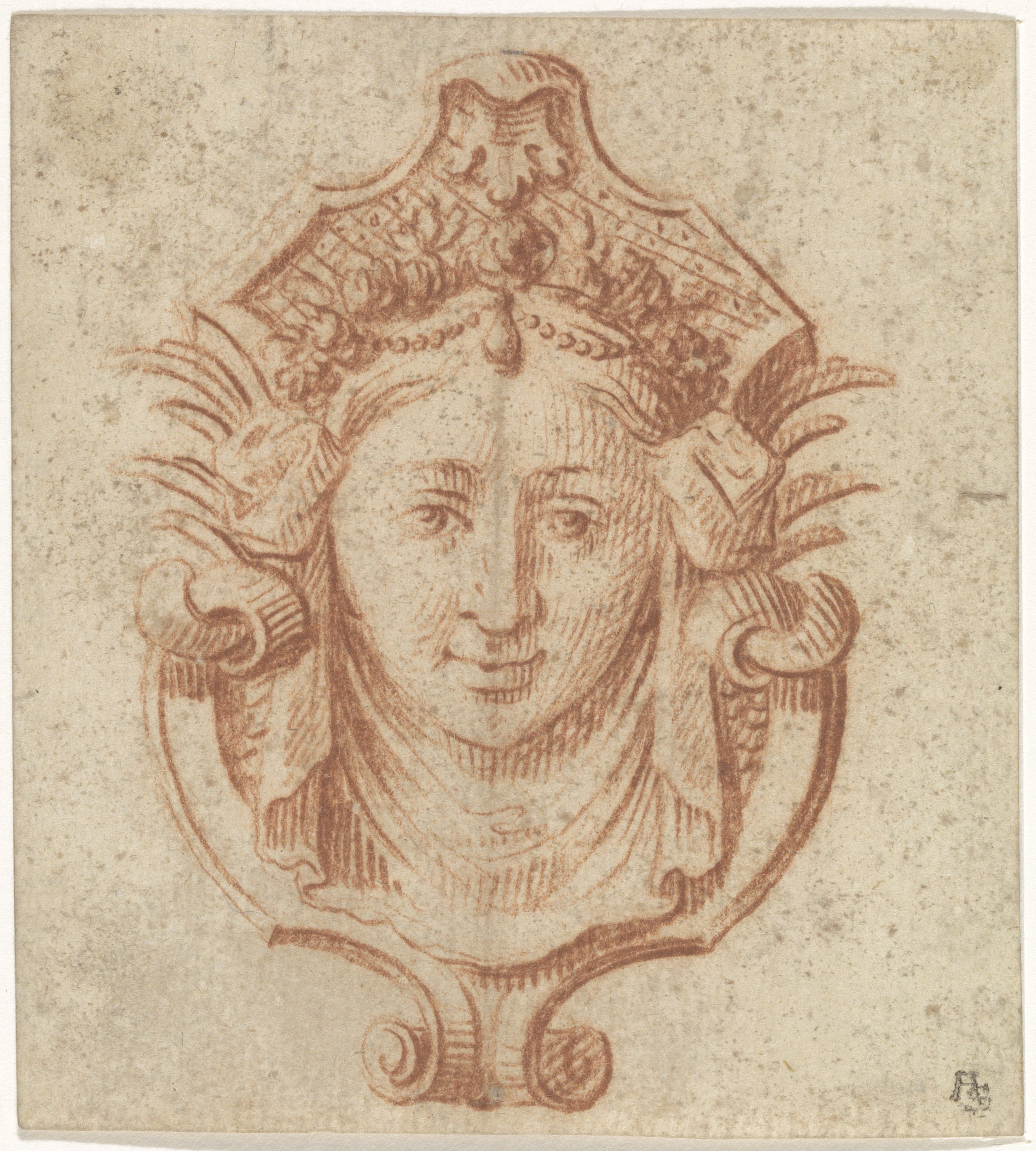 Schild van rolwerk met een vrouwenhoofd boven een dr...