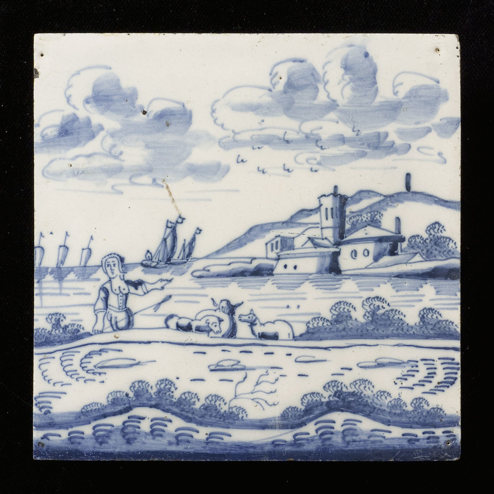 Tegel van keramiek, tinglazuur, voorstellende herder...