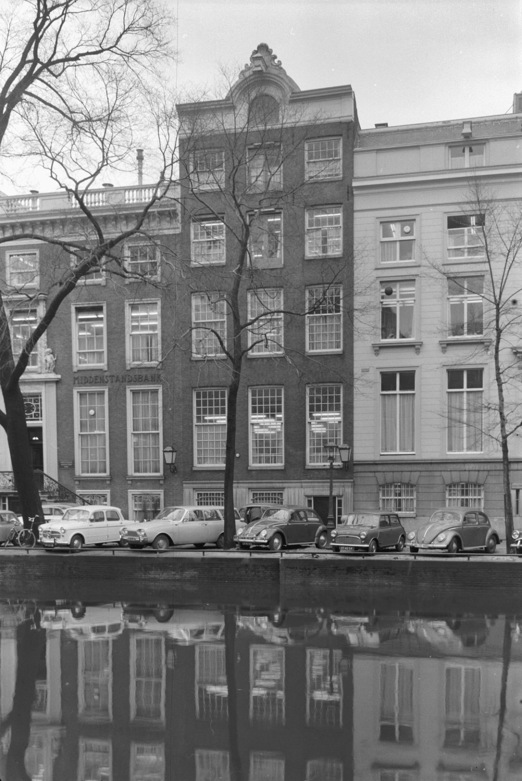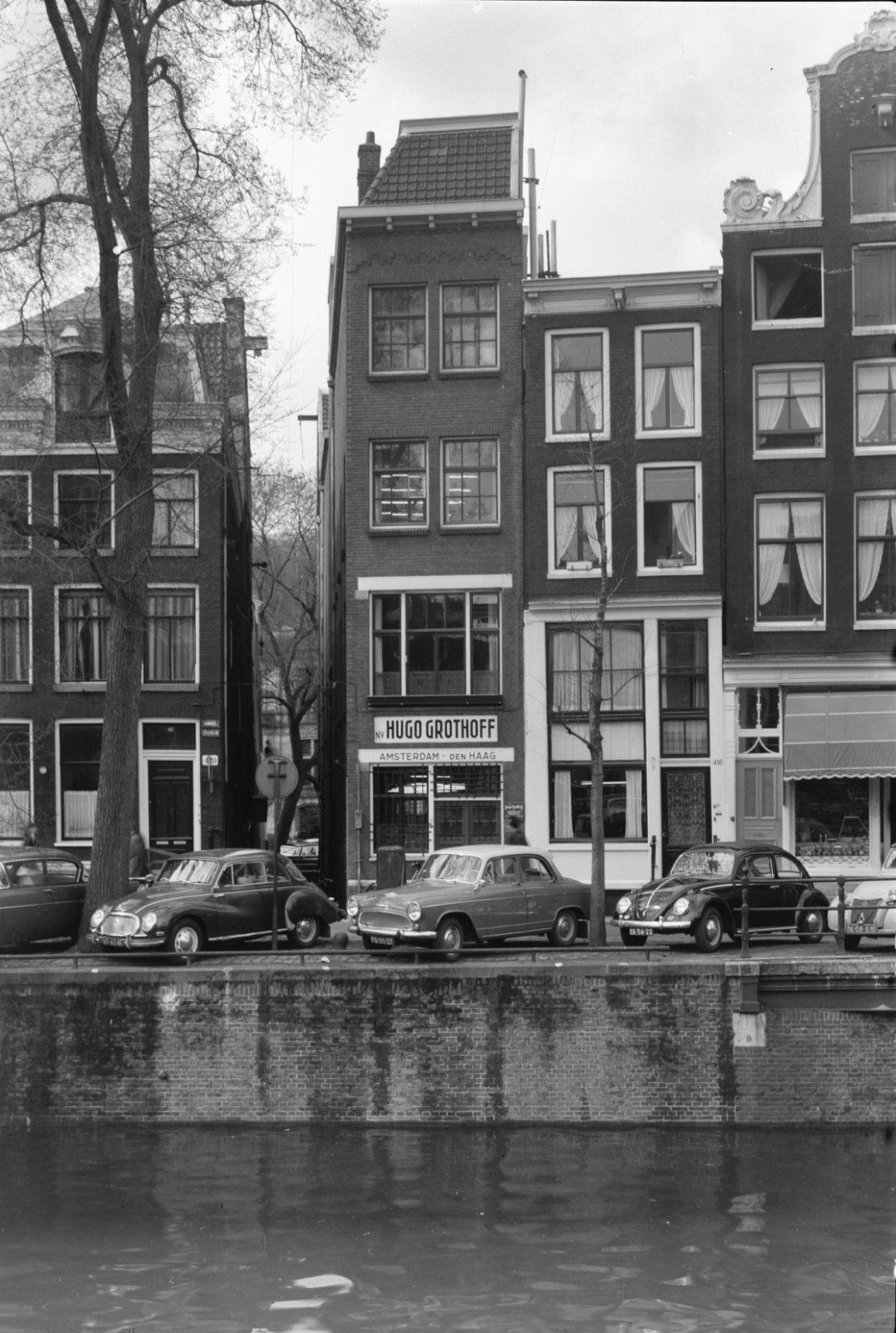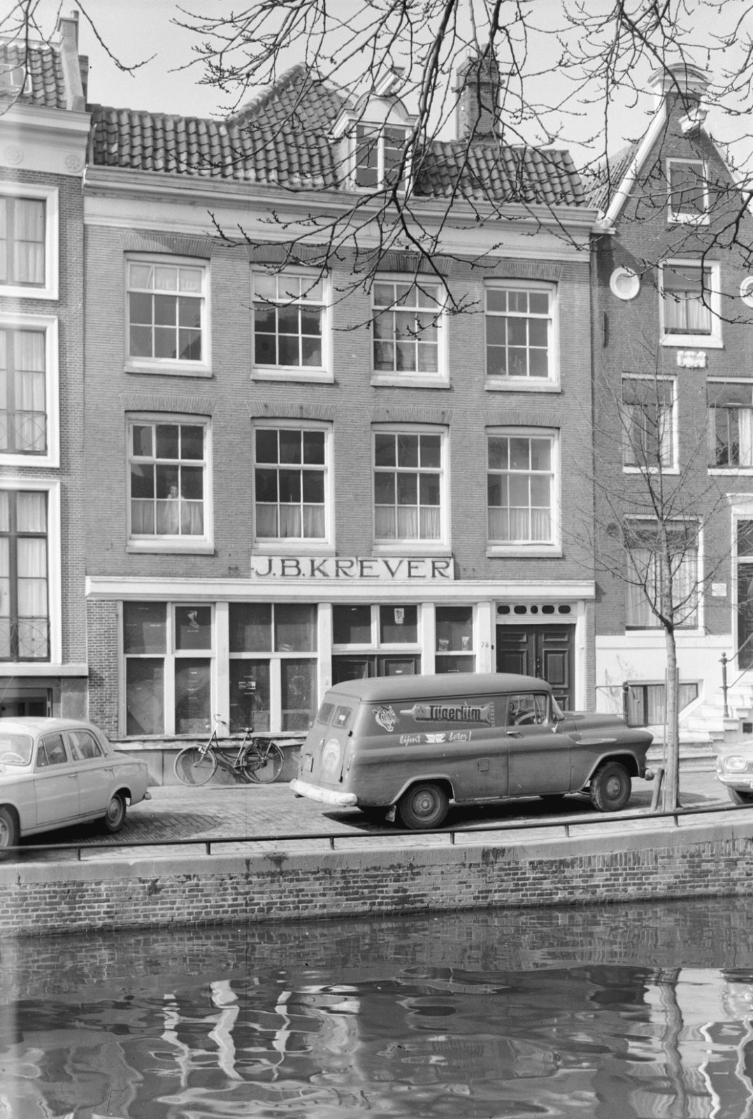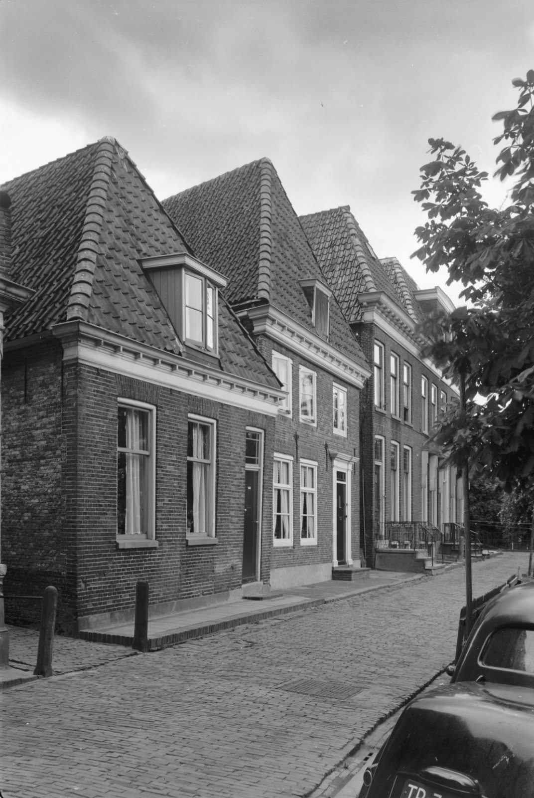 Voorgevel, langs gracht geparkeerde auto op de voorg...