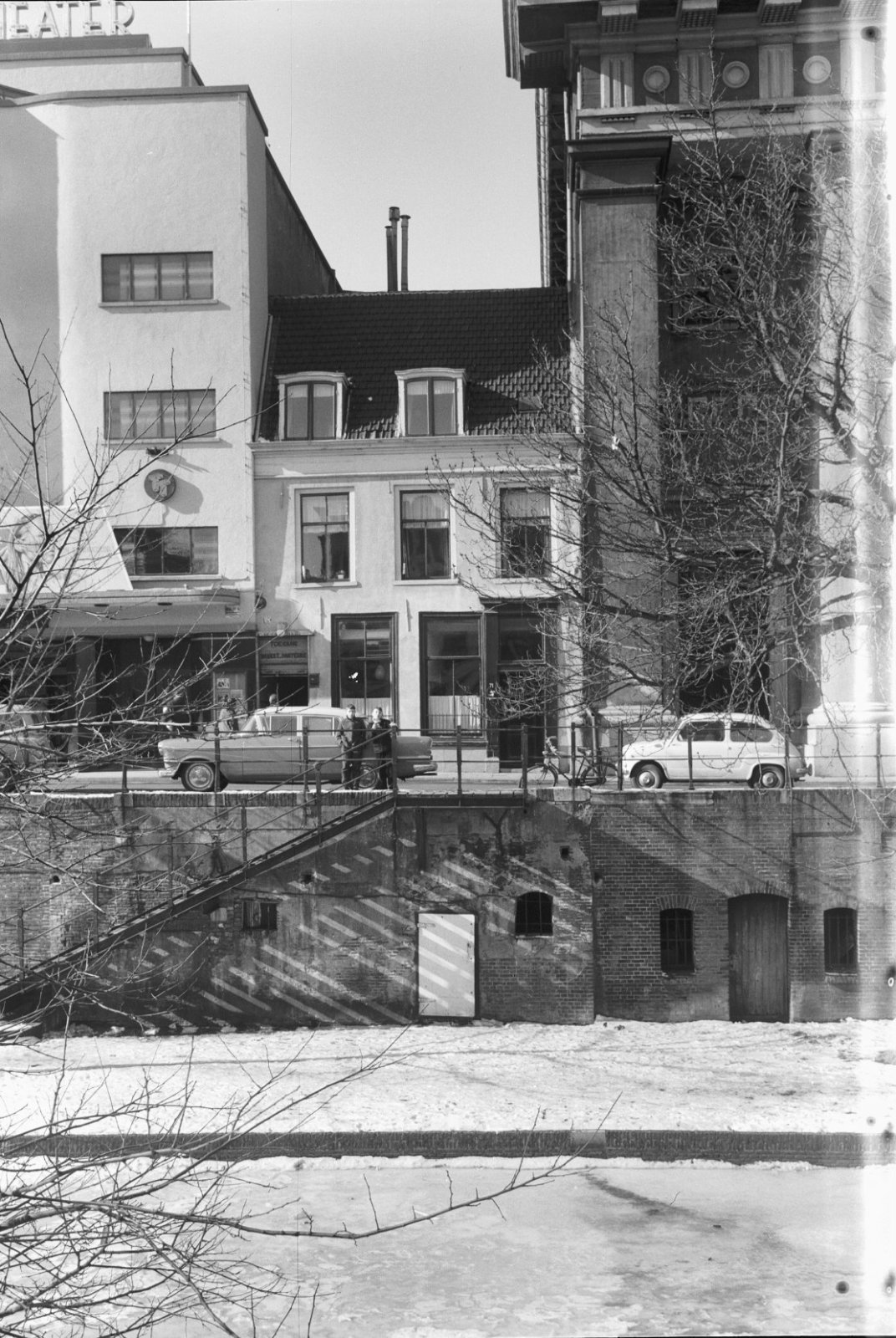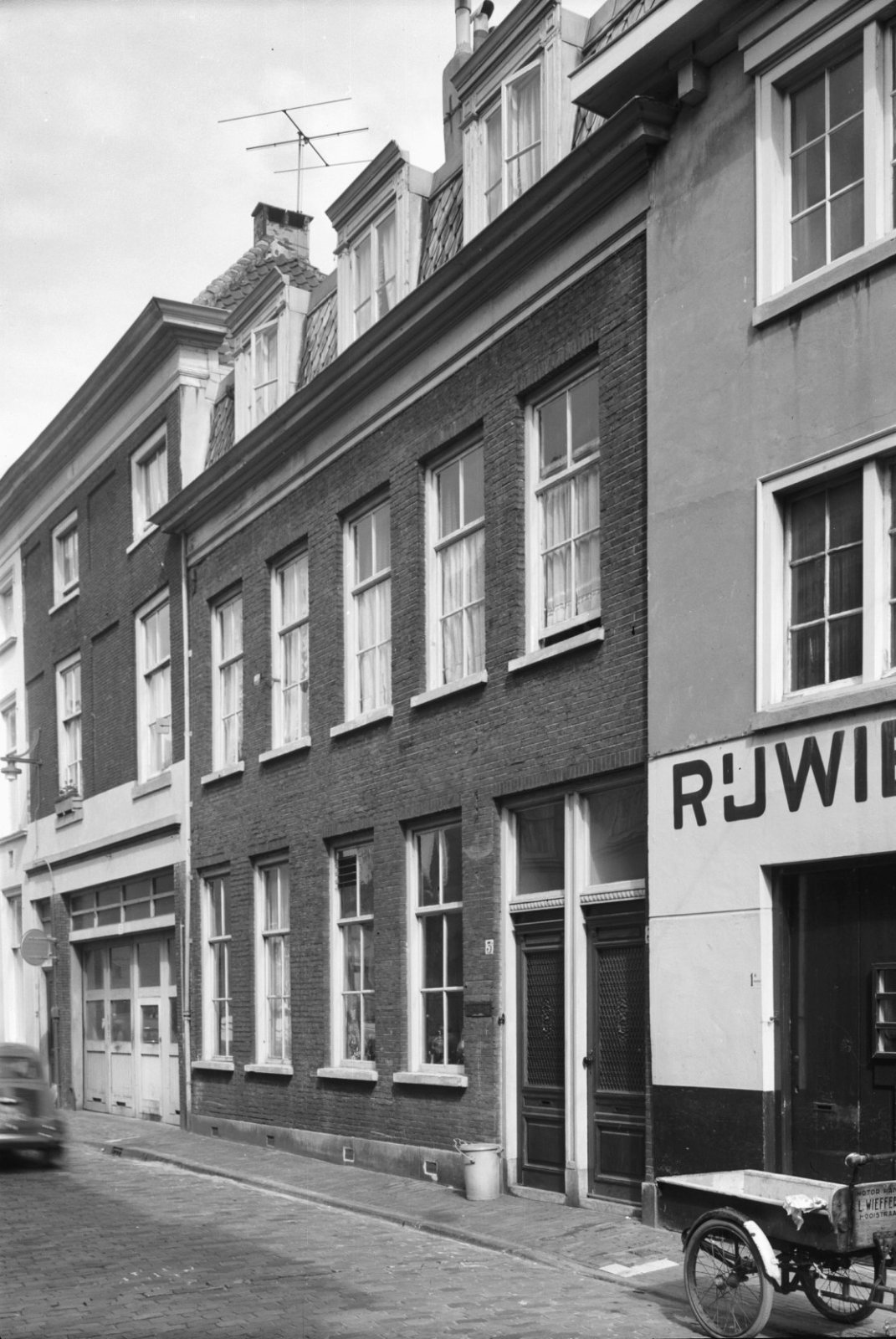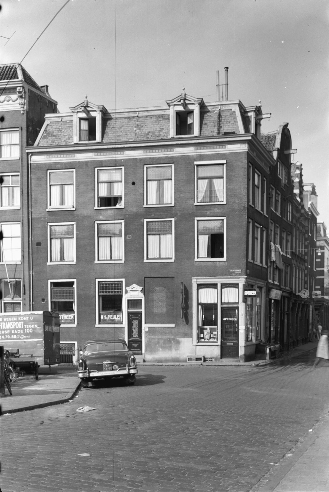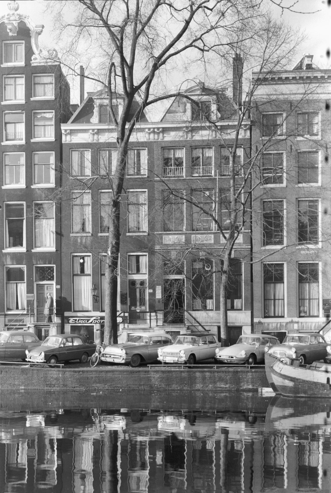 Voorgevel, langs gracht geparkeerde auto op de voorg...