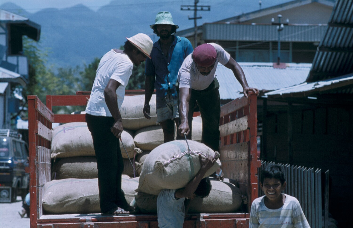 Het vervoer per auto en het inladen van zakken rijst...