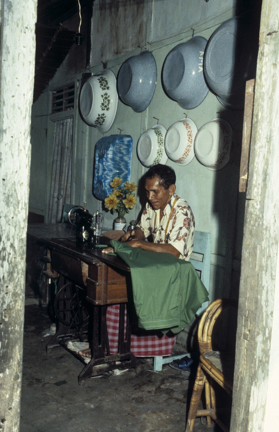 Een kleermaker aan het werk, Tulehu op Ambon, Molukken.