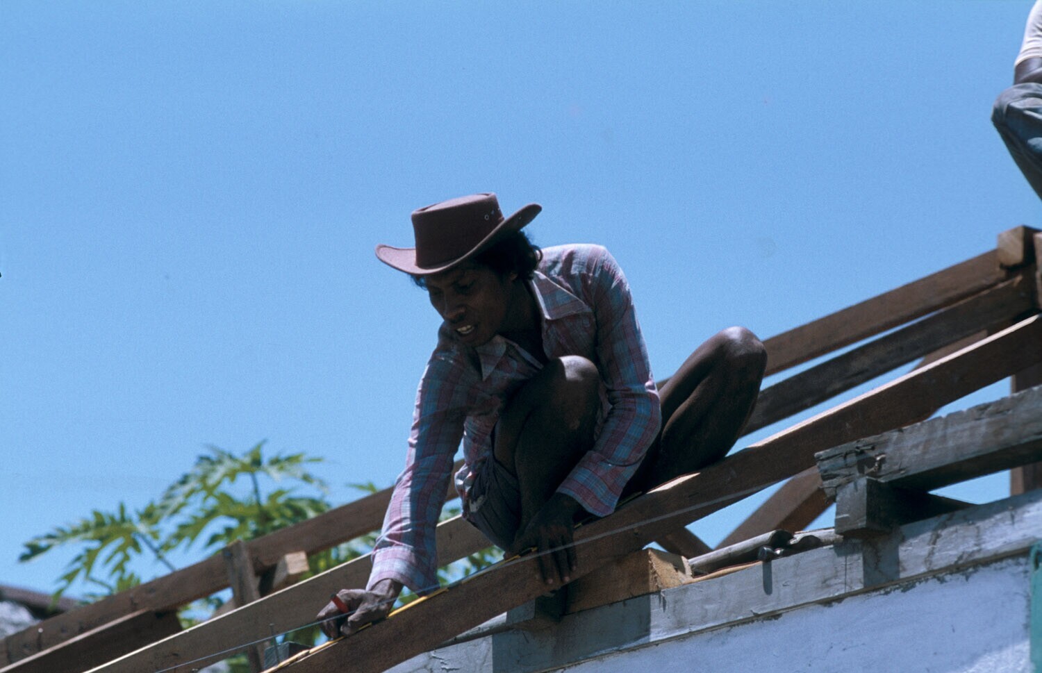 Timmerman wekt aan een dak. Tulehu op Ambon, Molukken.