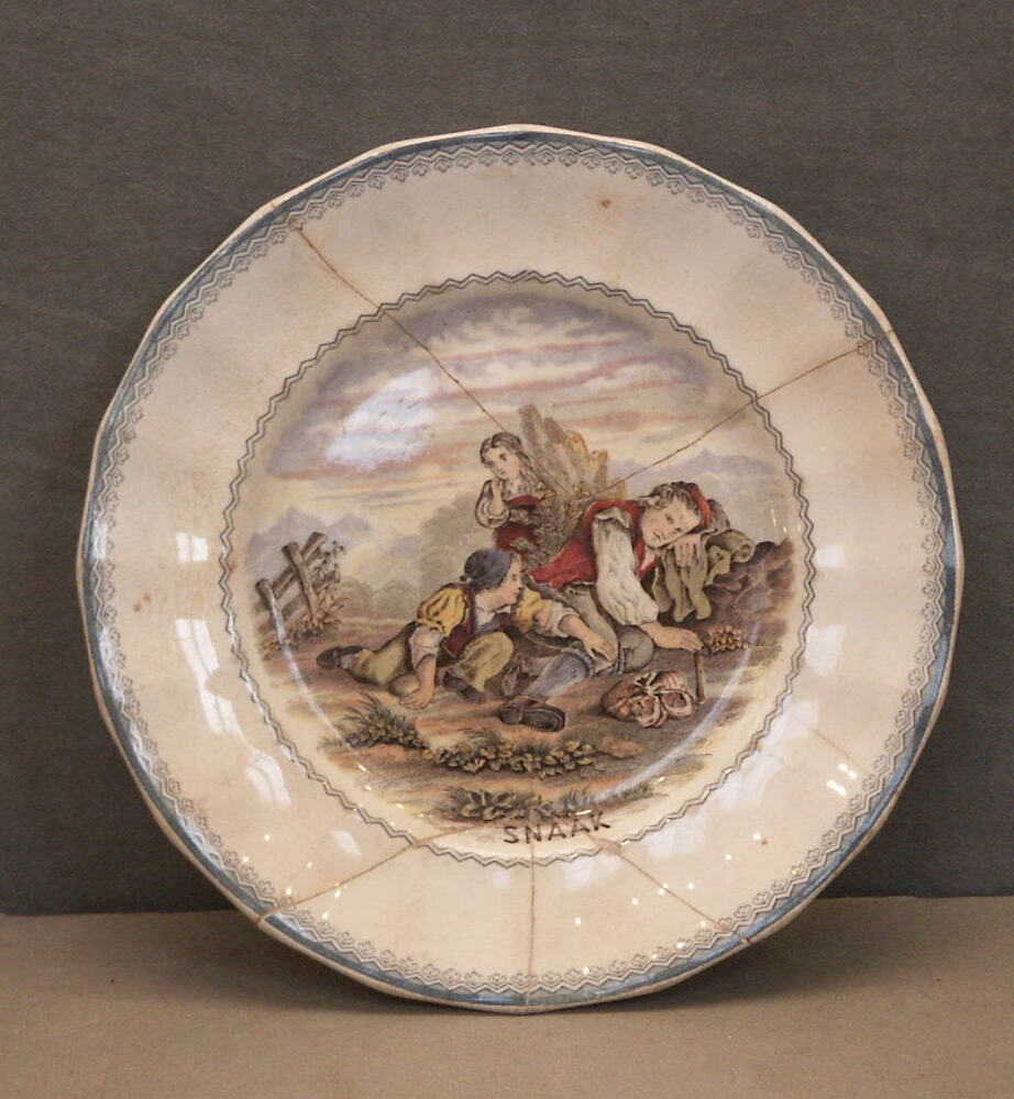 Bord van aardewerk, gedecoreerd met een tafereeltje ...