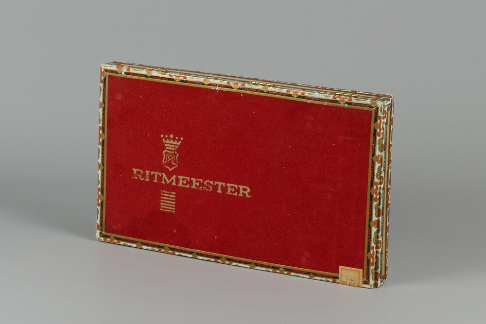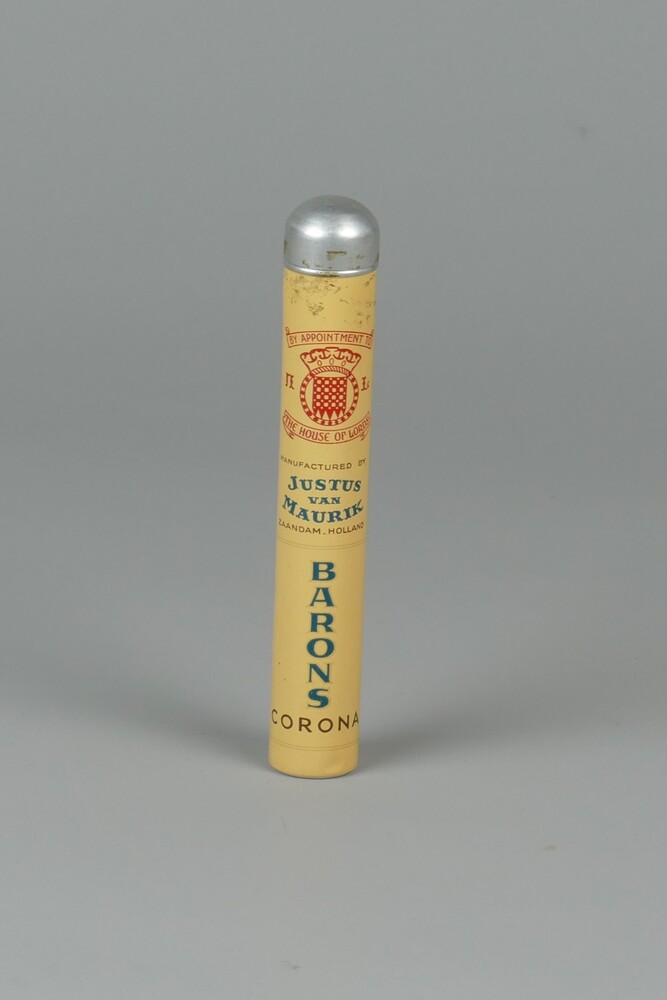 sigarenkoker, metaal met sigaar, op koker: Justus va...