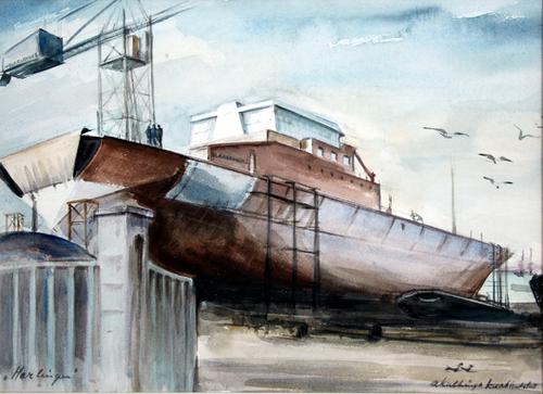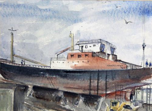 Aquarel met pen. Scheepsdeel VL70 Astrid in de takel...