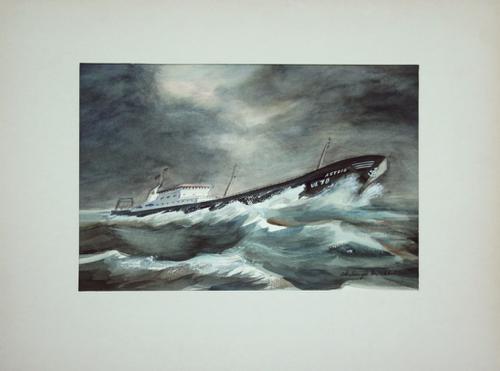 Aquarel met pen. Trawler VL70 Astrid op ruwe zee