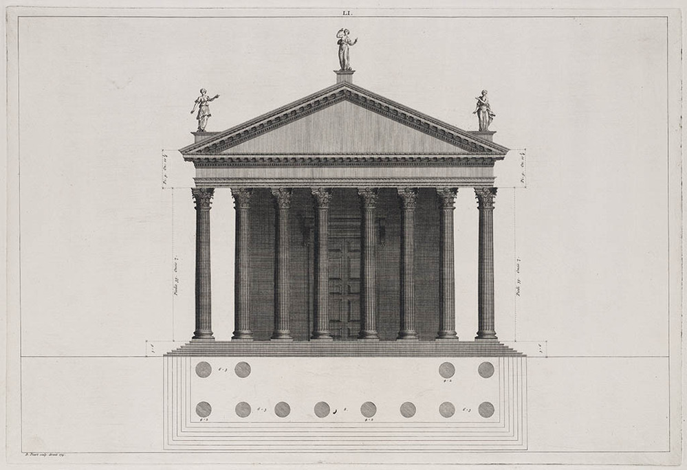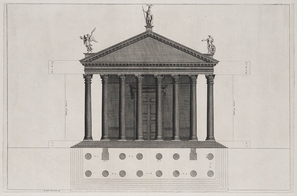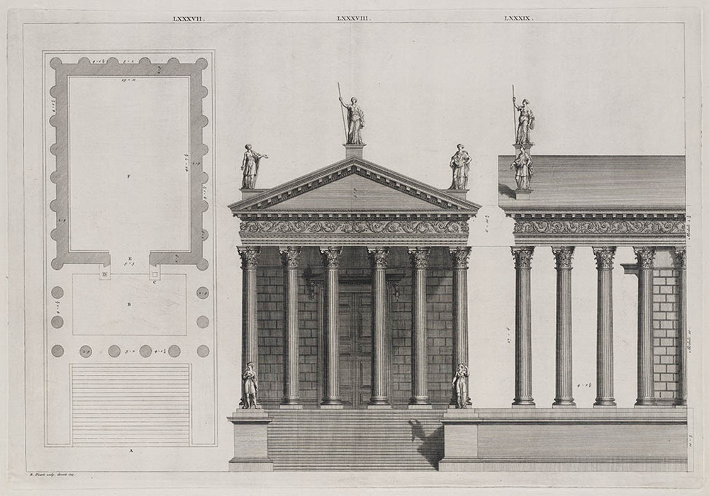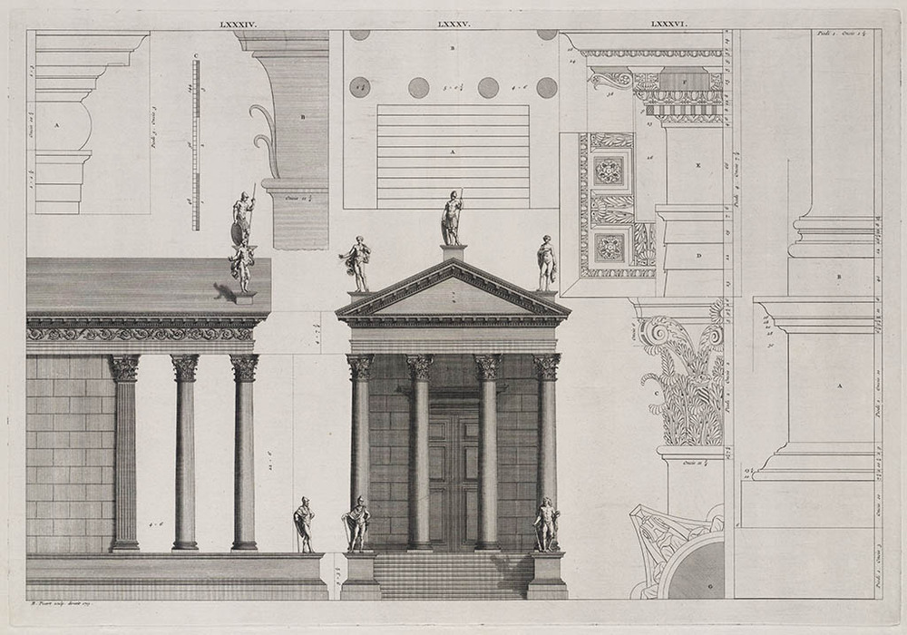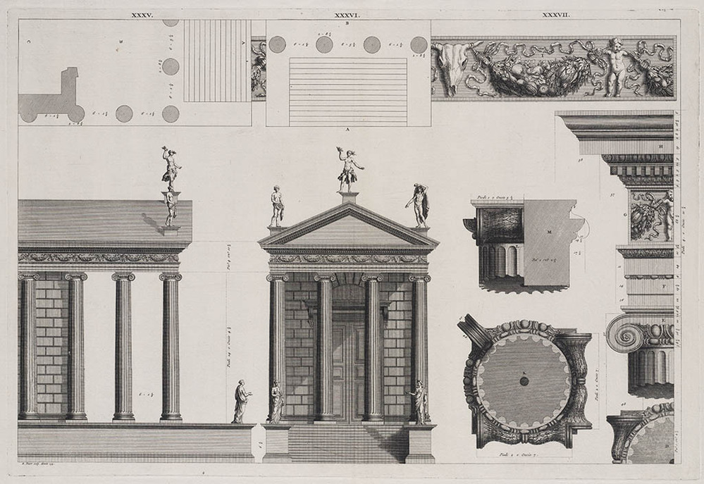 Voor- en zij-aanzicht van gebouw, details van orname...