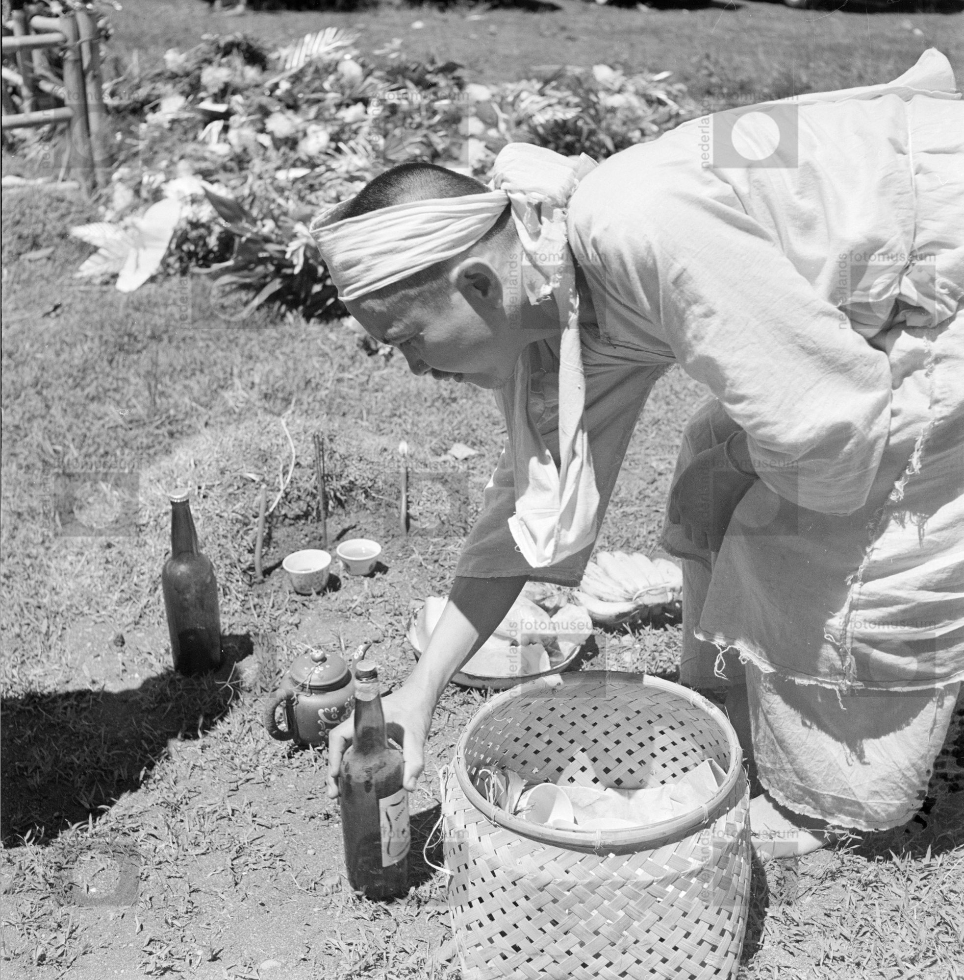 Oudste zoon in rouwkledij maakt offerandes klaar tij...