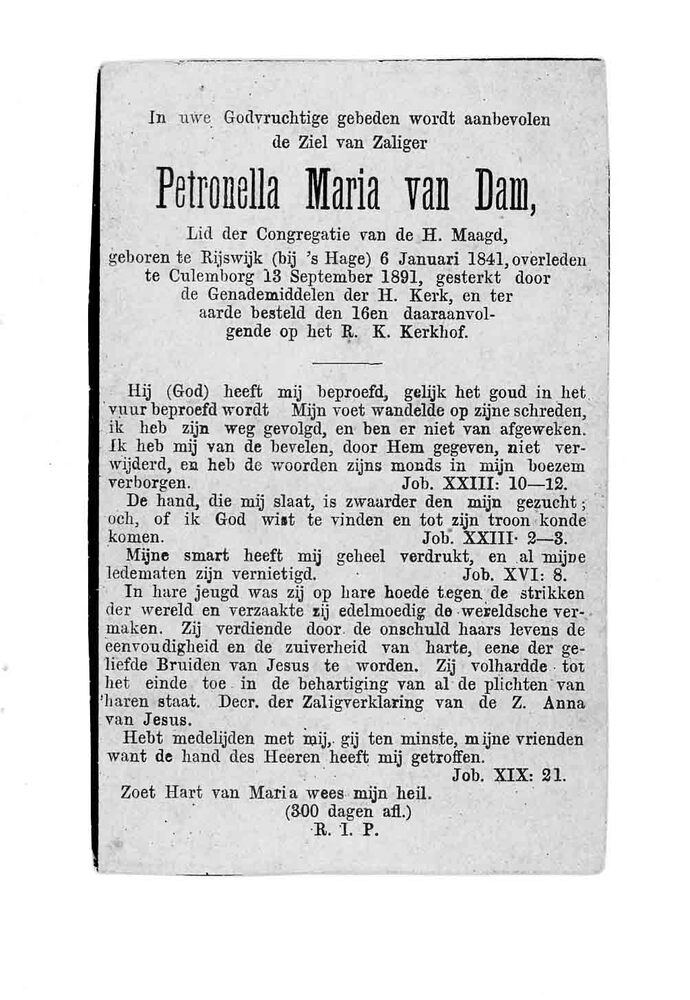 bidprent voor Petronella Maria van Dam. Geboren 06-0...