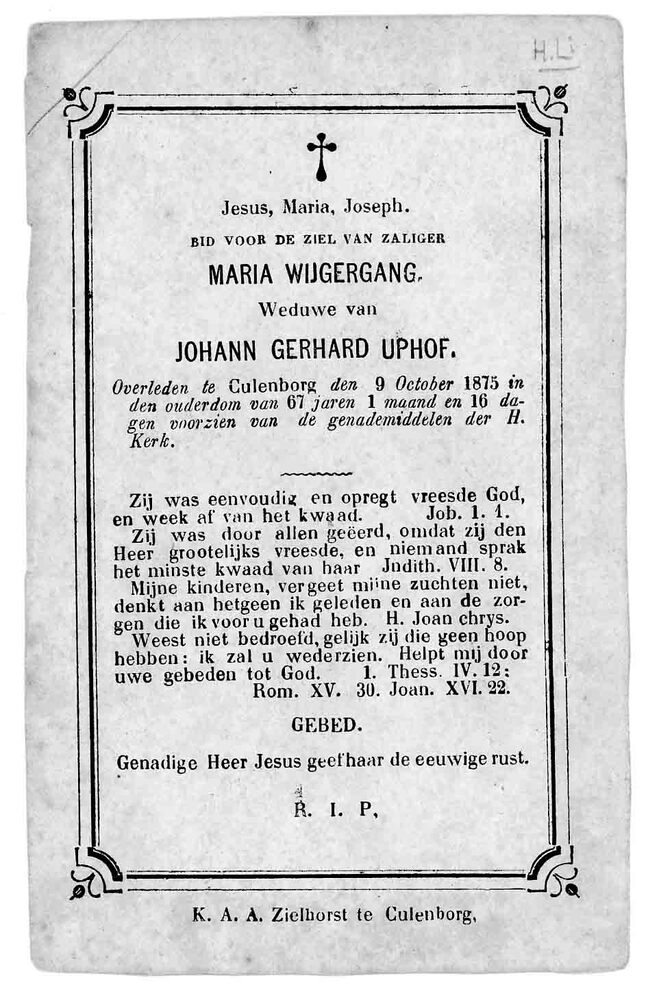 bidprent voor Maria Wijgergang. Geboren 1808. Overle...