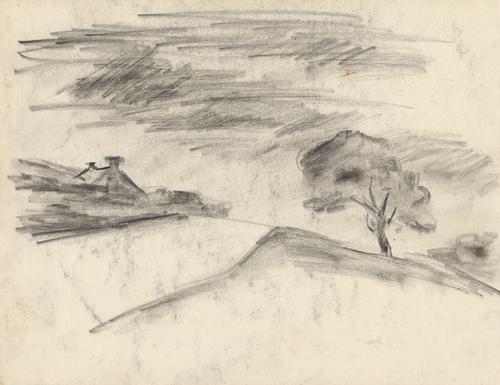 Landschap met boerderij en boom