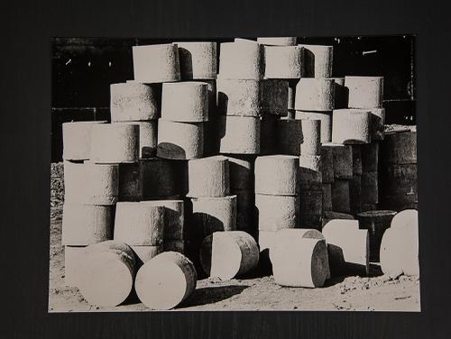 Zwart-wit foto van opgestapelde halfronde blokken be...