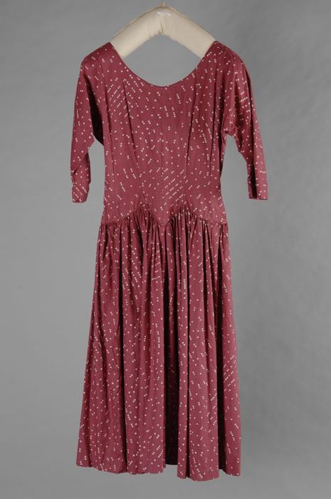 Paarsroze jurk met wit stippenpatroon, wijde rok, dr...