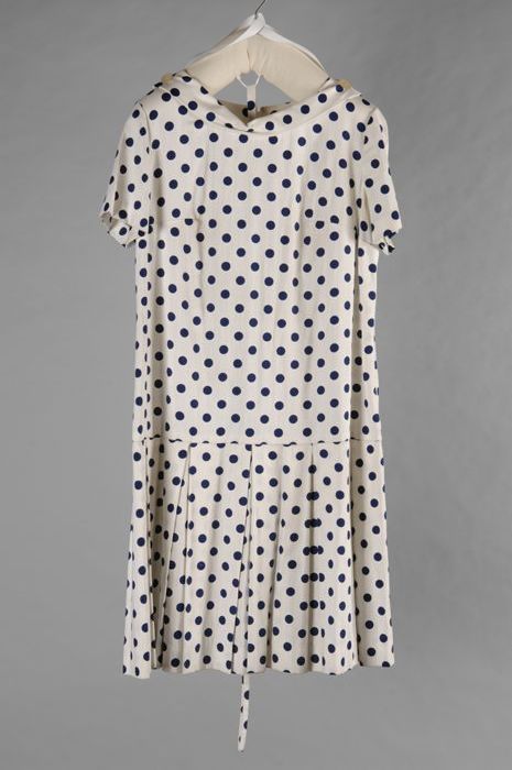 Zomerjurk, wit met donkerblauwe stippen, met plooirok