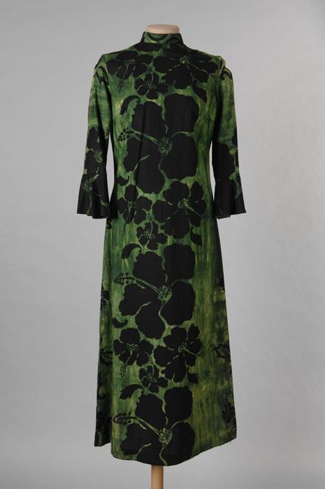 Lange jurk, batik effect, gevlamd groene stof bedruk...
