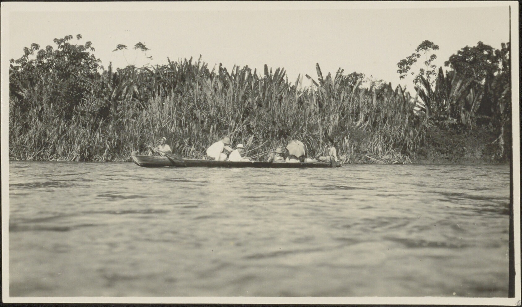 Rivier met kano's, gezien vanaf de oever