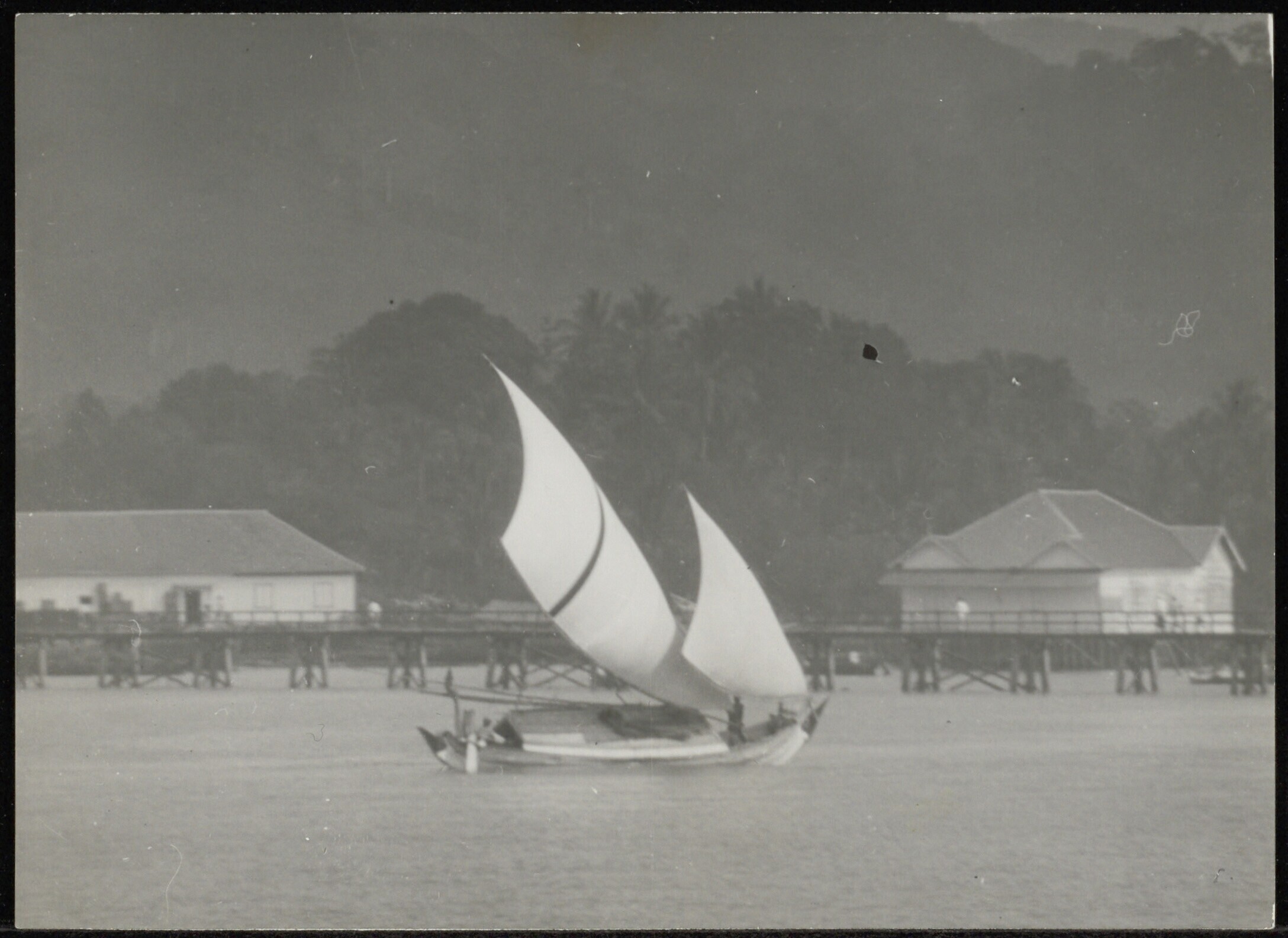 Een volle zeilen voerende prauw voor de haven van Ba...