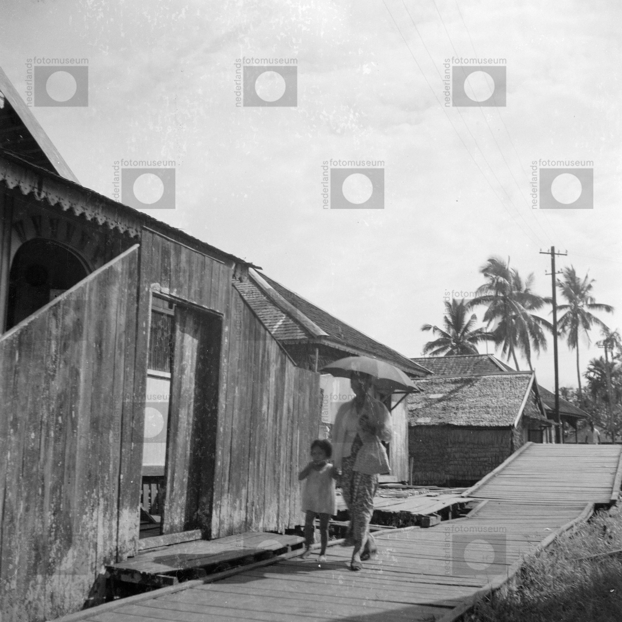 Loopbrug tussen paalwoningen door in Pontianak op Bo...