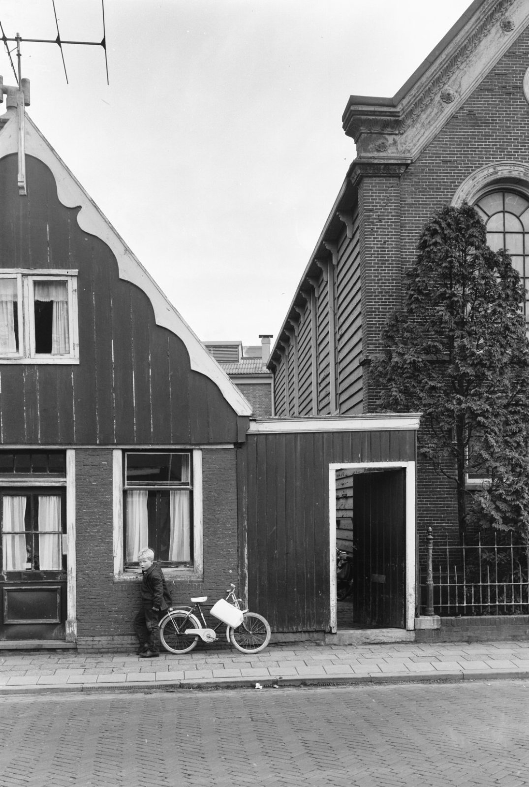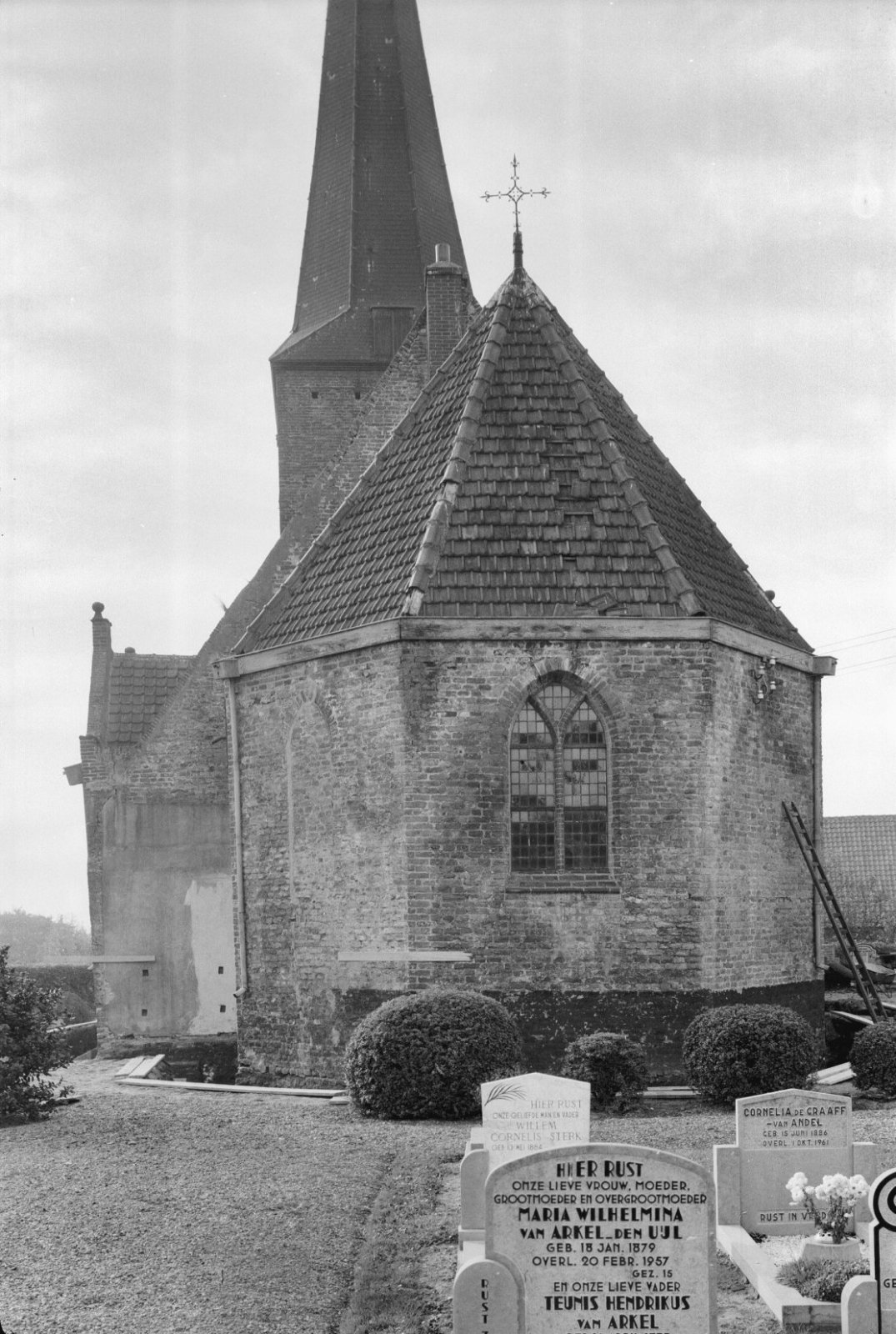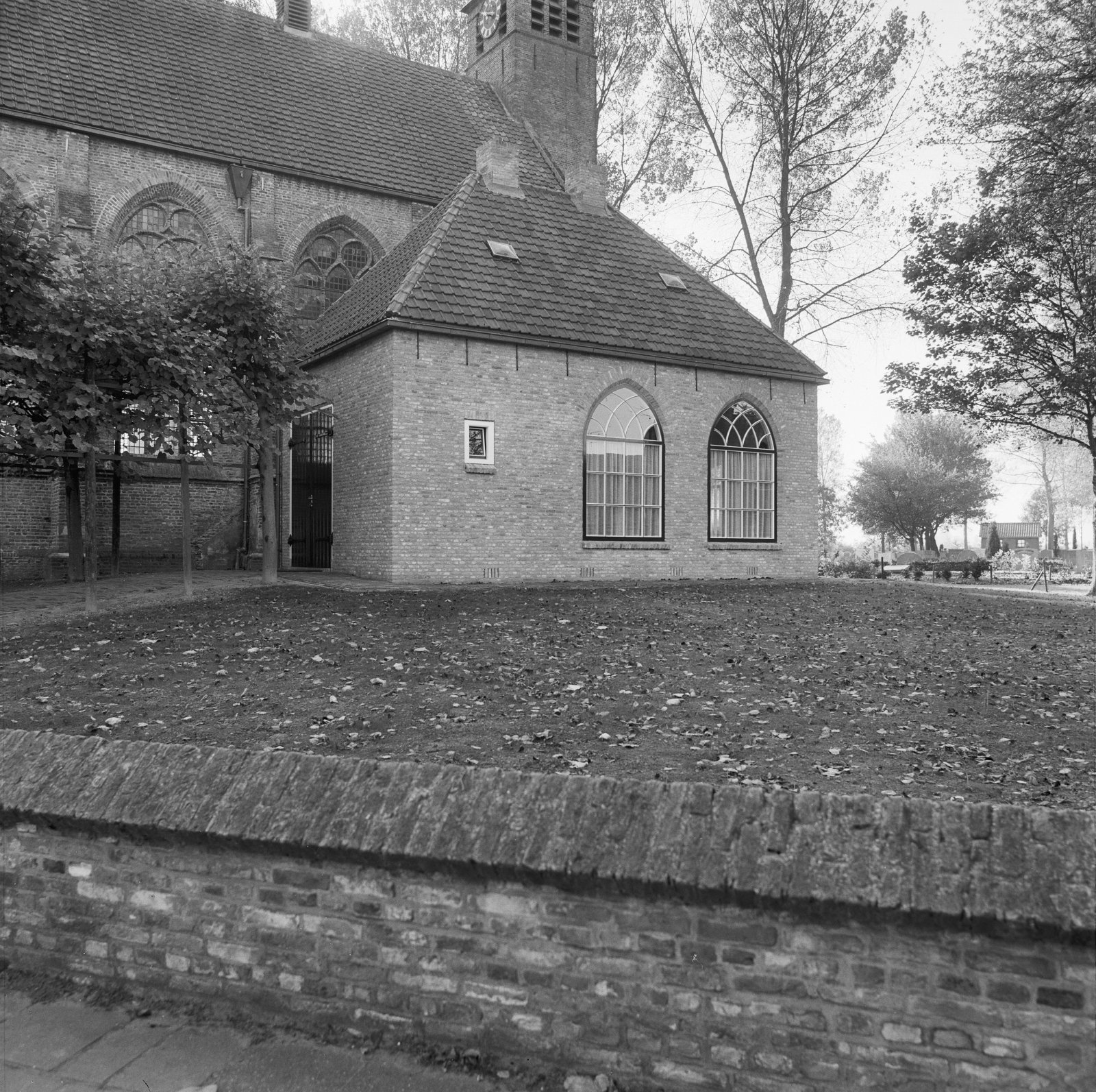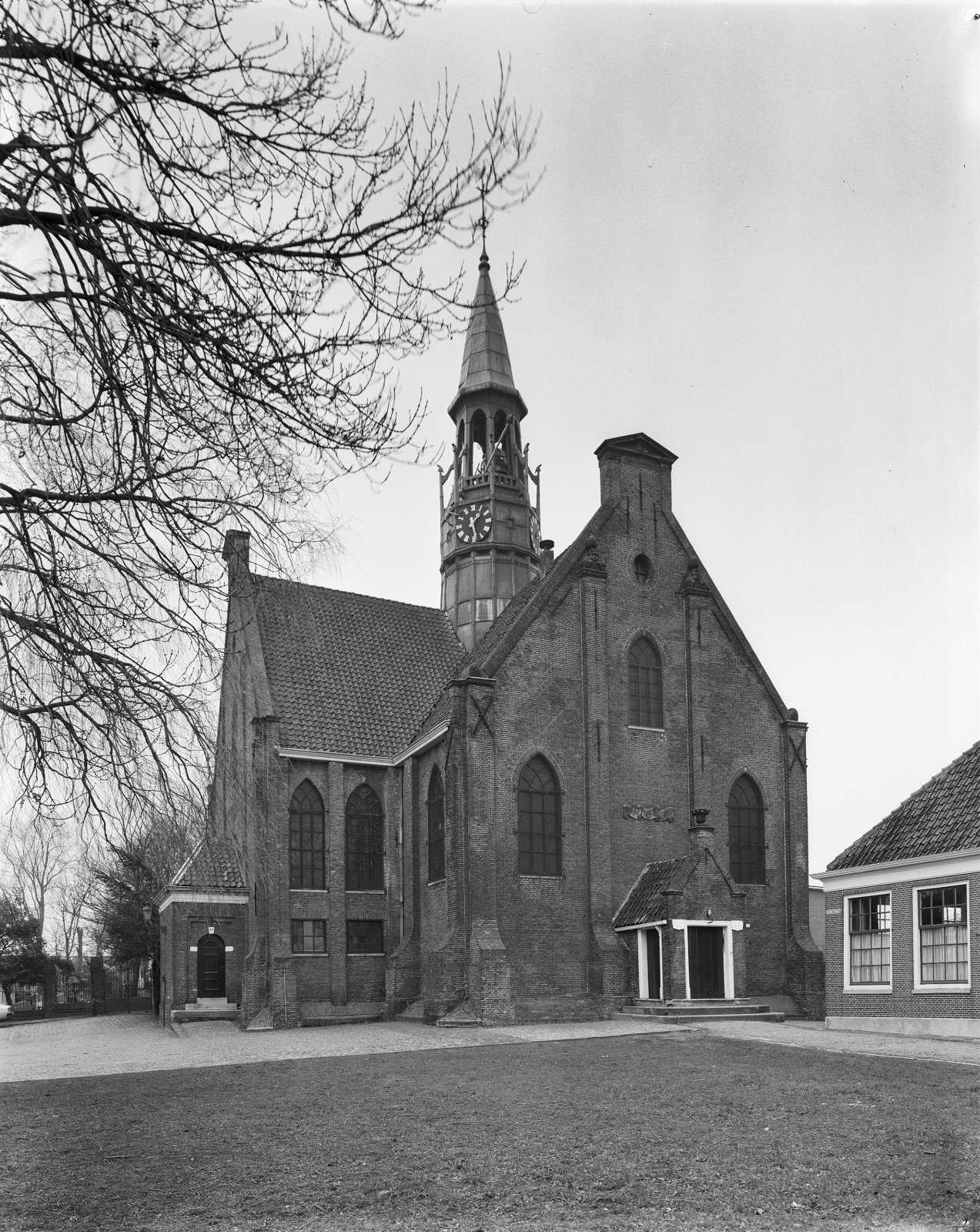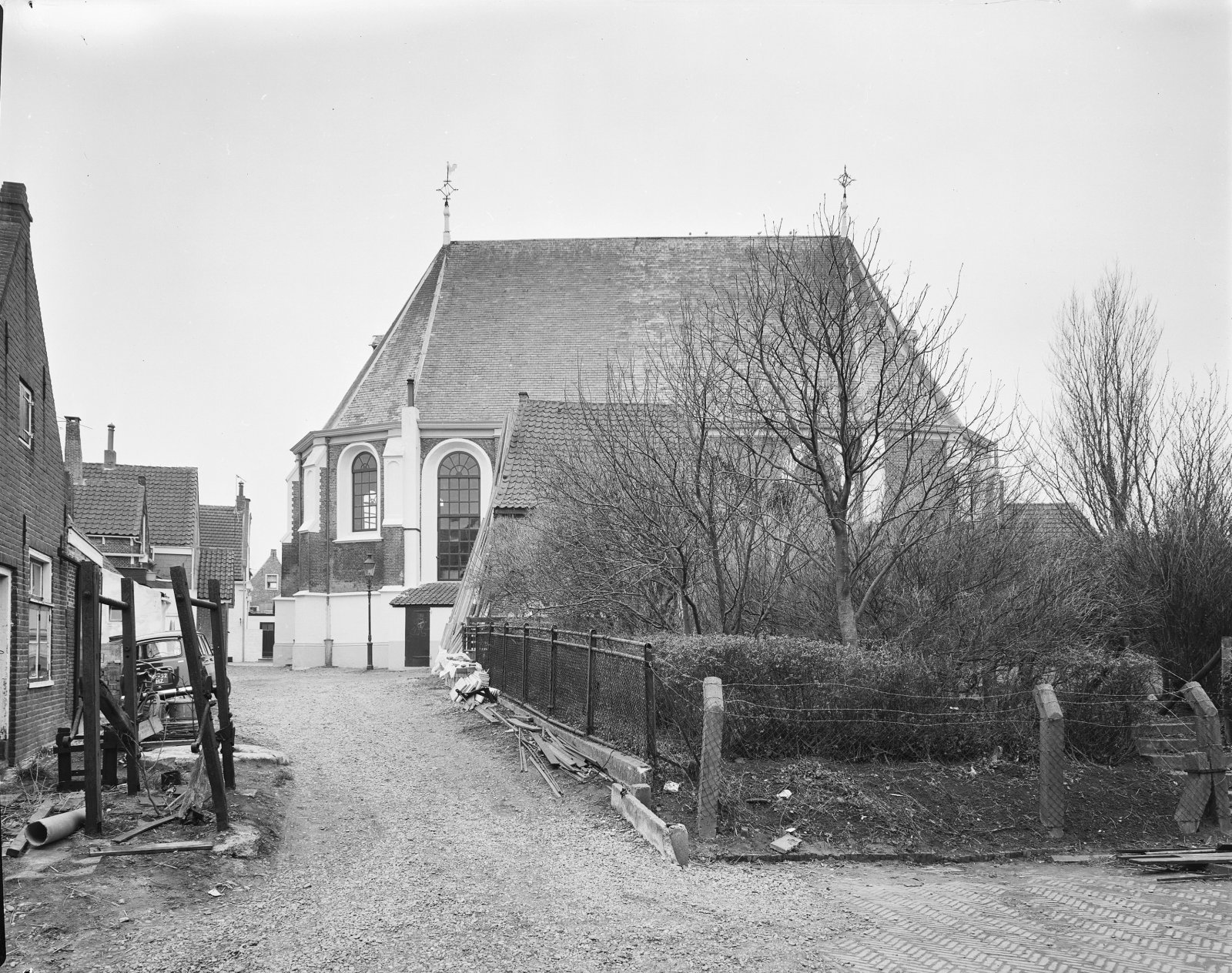 Vooraanzicht van de kerk met op de voorgrond een oud...