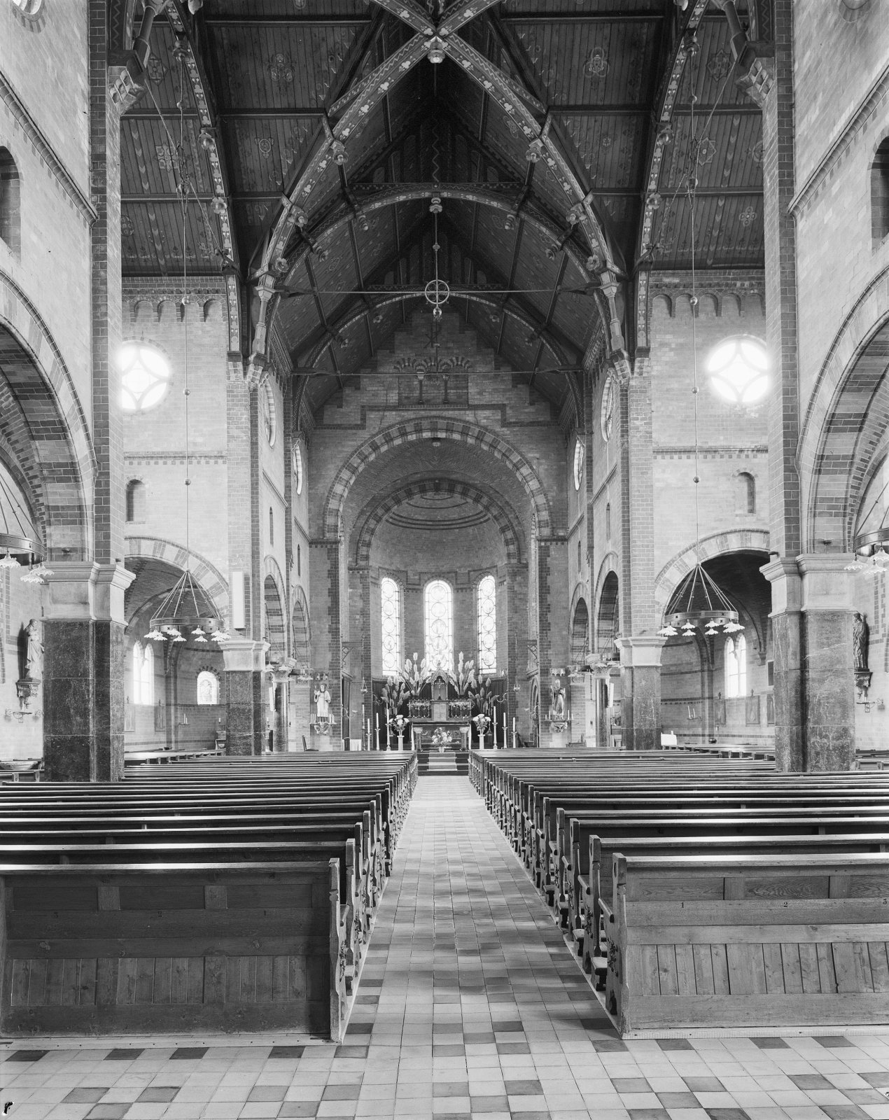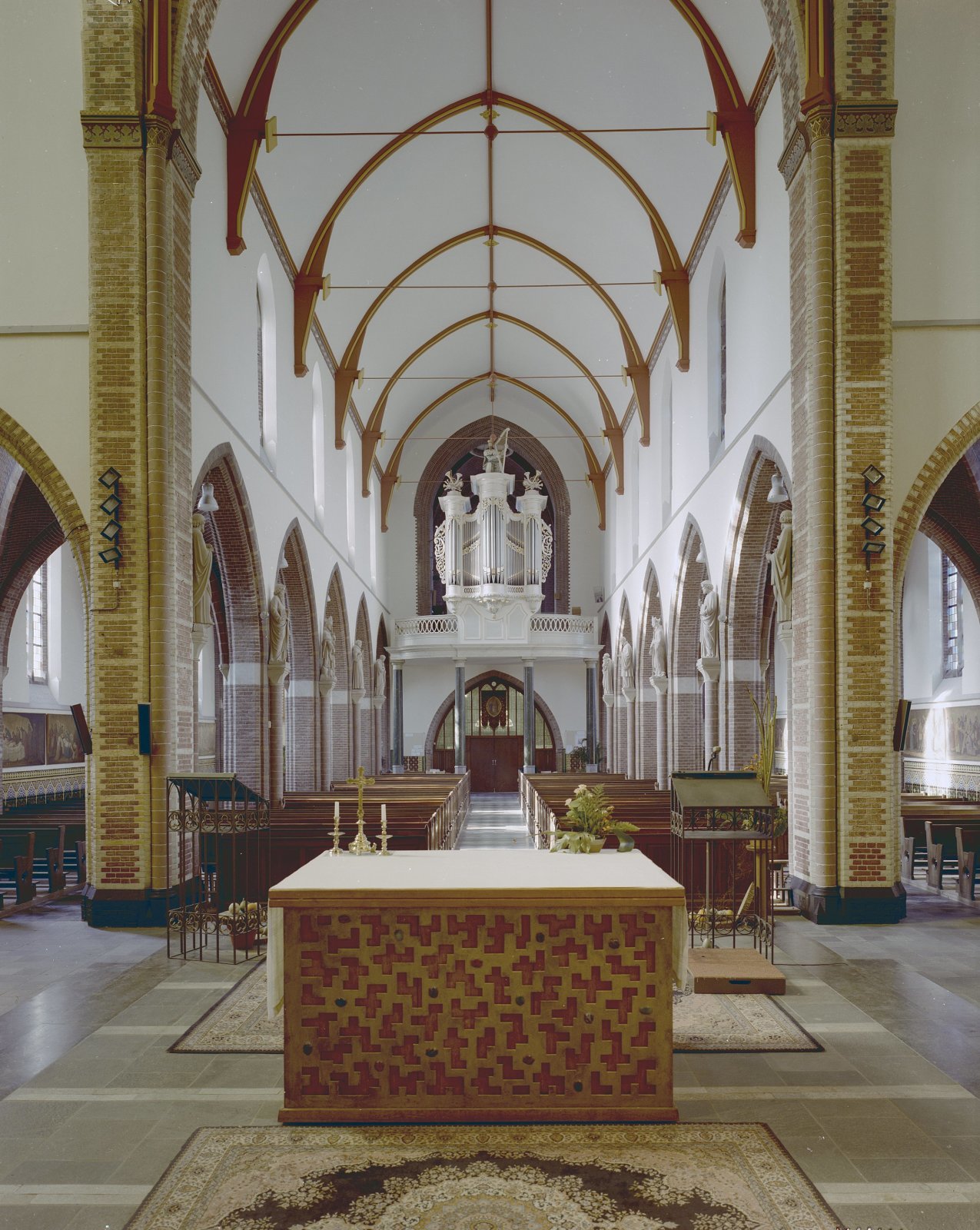 Interieur, overzicht schip met altaar, spitstongewel...